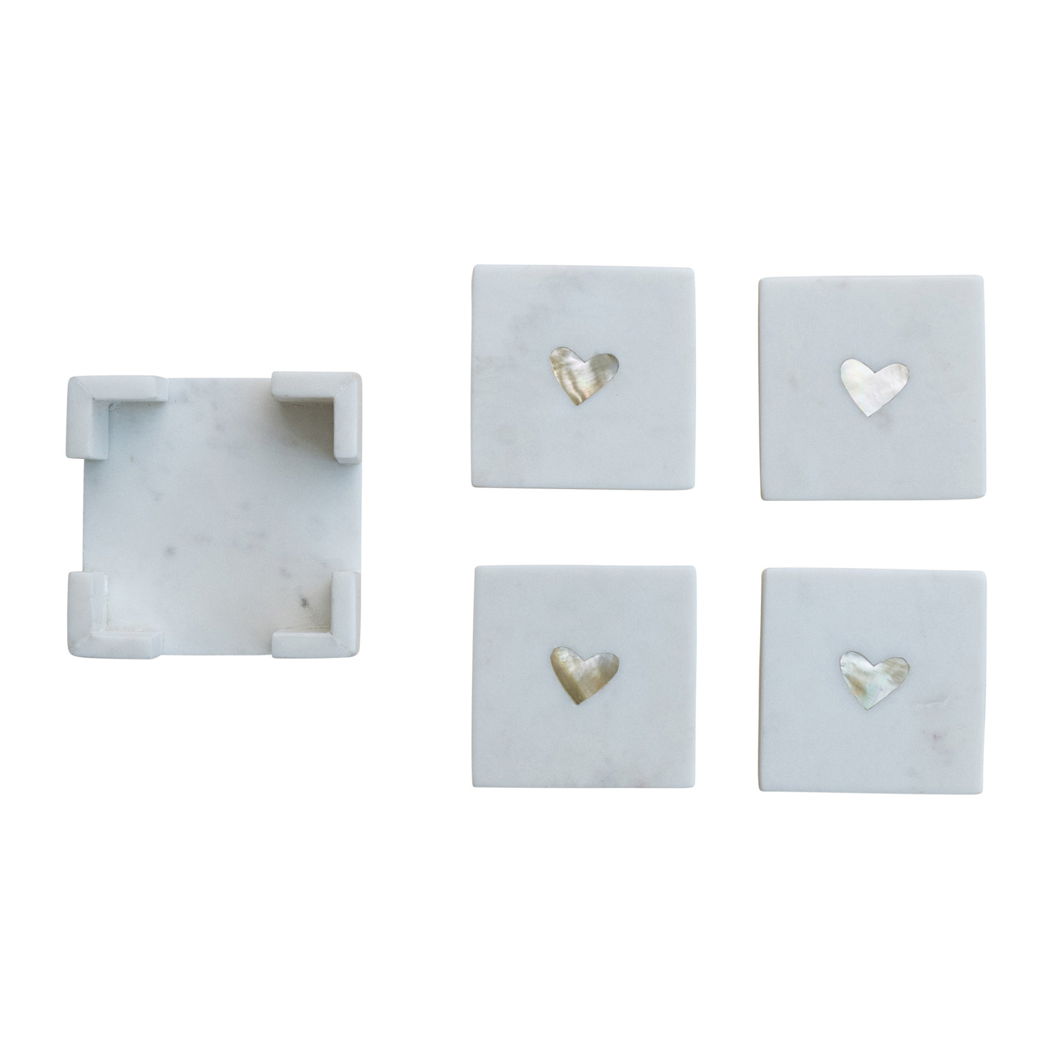 Catalog Name: 4" Square Marble Coasters w/ Heart Shaped Mother of Pearl Inlay & Holder, White & Natural, Set of 5