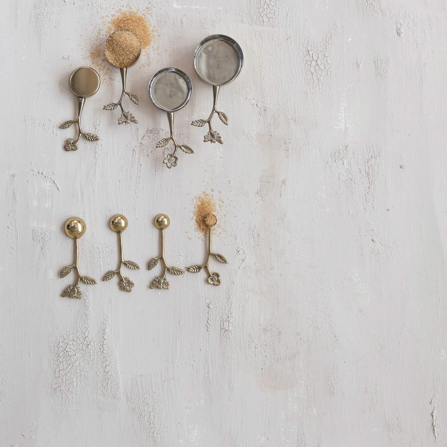 Catalog Name: 1, 1/2, 1/3 & 1/4 Cup Stainless Steel & Cast Aluminum Measuring Cups w/ Leaf & Flower Handles, Gold Finish, Set of 4