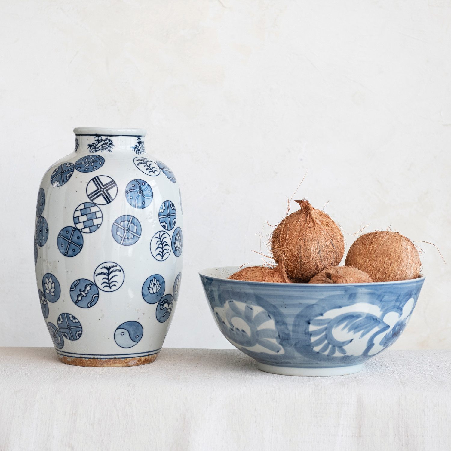 Catalog Name: 14" Round x 5-3/4"H Hand-Painted Stoneware Bowl w/ Design, Blue & White