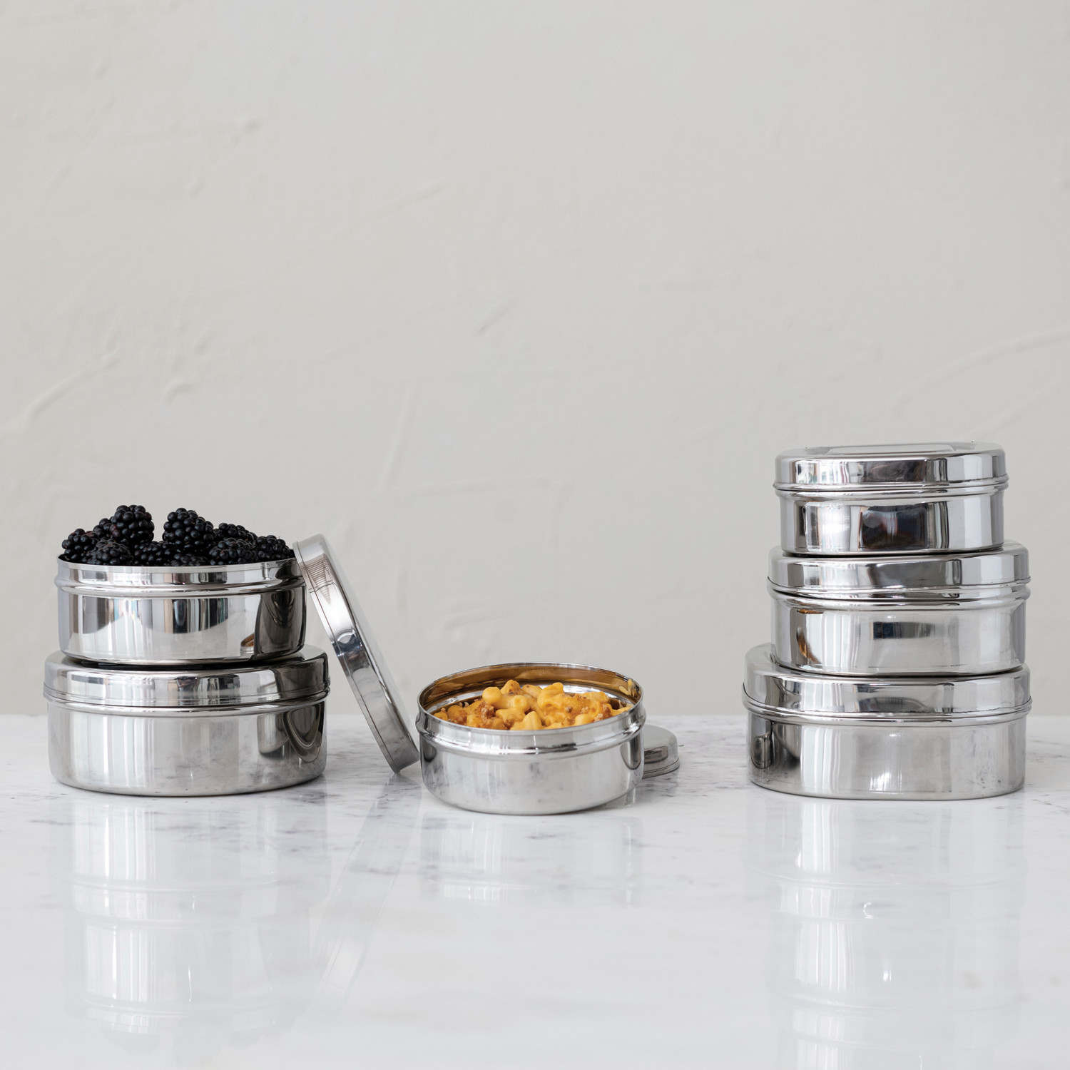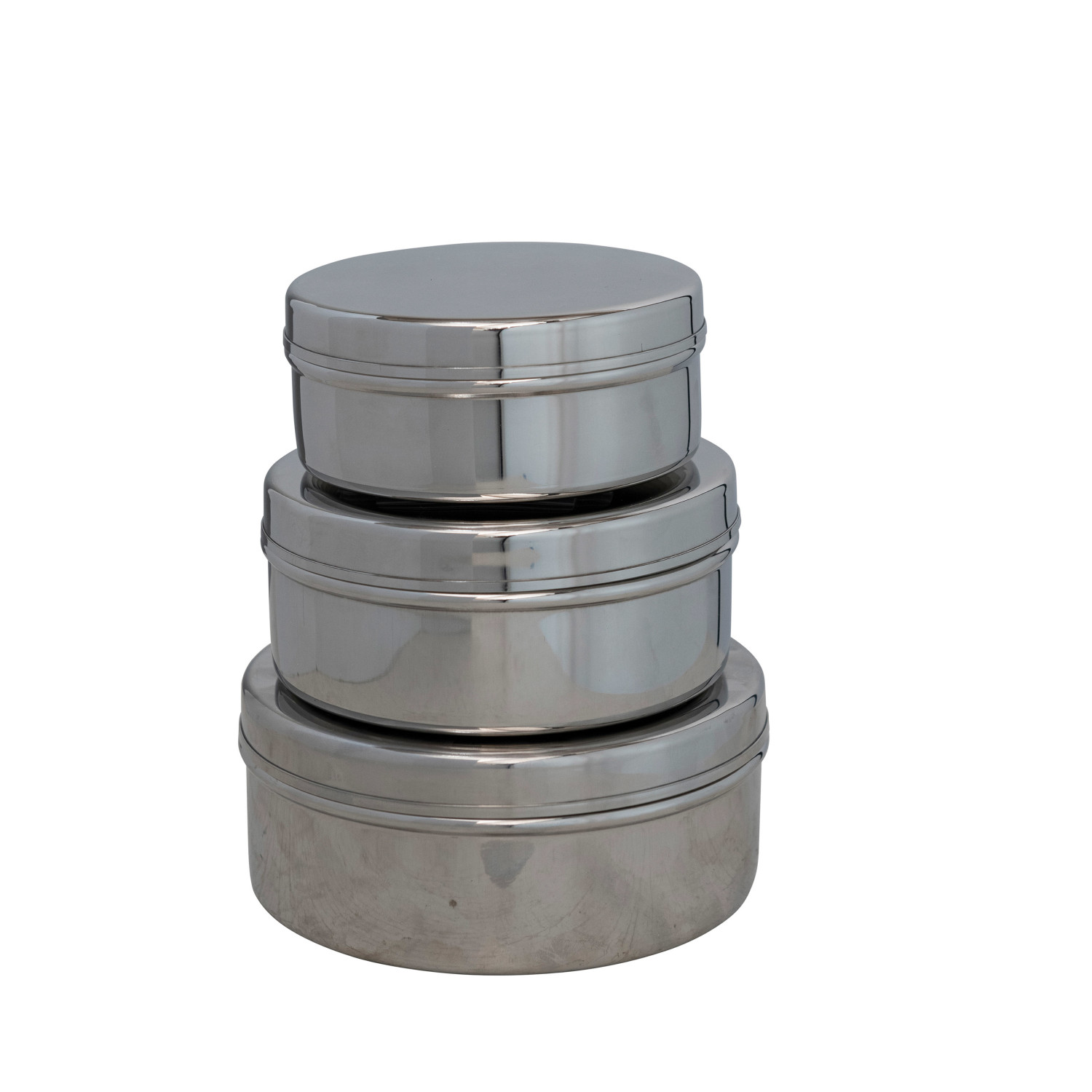 Catalog Name: 5-1/2" Round x 2-1/4"H, 5" Round x 2"H & 4-1/2" Round x 1-3/4"H Stainless Steel Containers, Set of 3