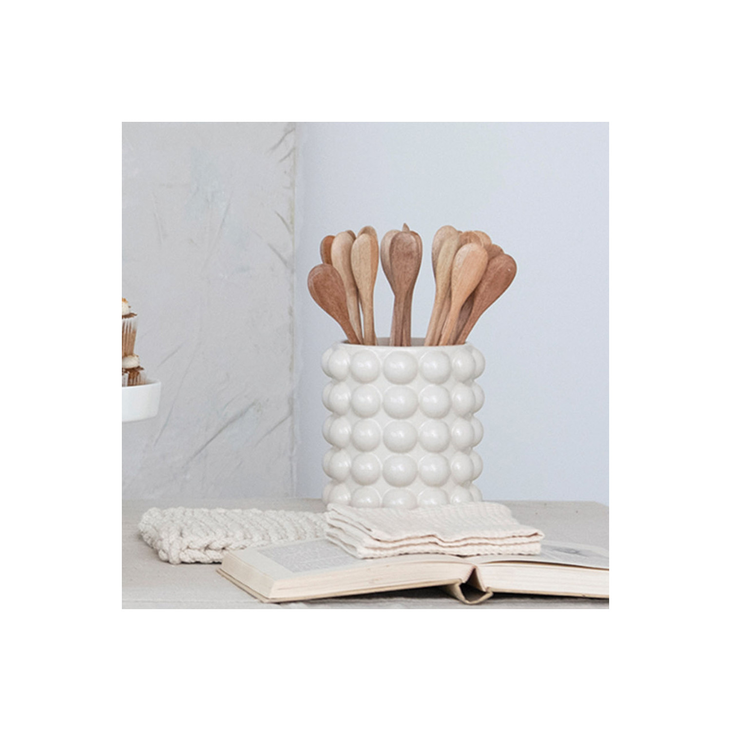 Introducing the exquisite collection of food storage solutions for home and office design enthusiasts. They come in different shapes, sizes, materials, and designs to cater to one's unique requirements. The food storage collection offers both style and functionality, ranging from sleek and minimalist to charming and rustic. Choose from various options involving round, square, and rectangular containers made from high-quality materials such as glass, stainless steel, and BPA-free plastics. The storage solutions have secure lids and airtight seals that retain the freshness and organization of food. The food storage complements any interior decor theme, whether one prefers modern elegance or timeless charm. Enhance one's kitchen or office pantry with these essential and versatile storage solutions, which offer convenience of use and aesthetic appeal. The diverse collection of food storage solutions delivers an excellent experience with uncompromised quality. Organize any kitchen with style using this round stoneware canister with a charming raised dot pattern and acacia wood lid that provides a natural and rustic touch, keeping any food fresh and protected. With raised dots, an acacia wood lid, and a clean white color, this stoneware canister seamlessly blends into various kitchen styles, from modern farmhouse to contemporary, and can be displayed on countertops, shelves, or islands. Designed for dry food storage, this canister is perfect for keeping the pantry staples fresh and within reach, storing cookies, pasta, rice, cereal, or any other dry goods that require an airtight container. Made of stoneware and acacia wood.