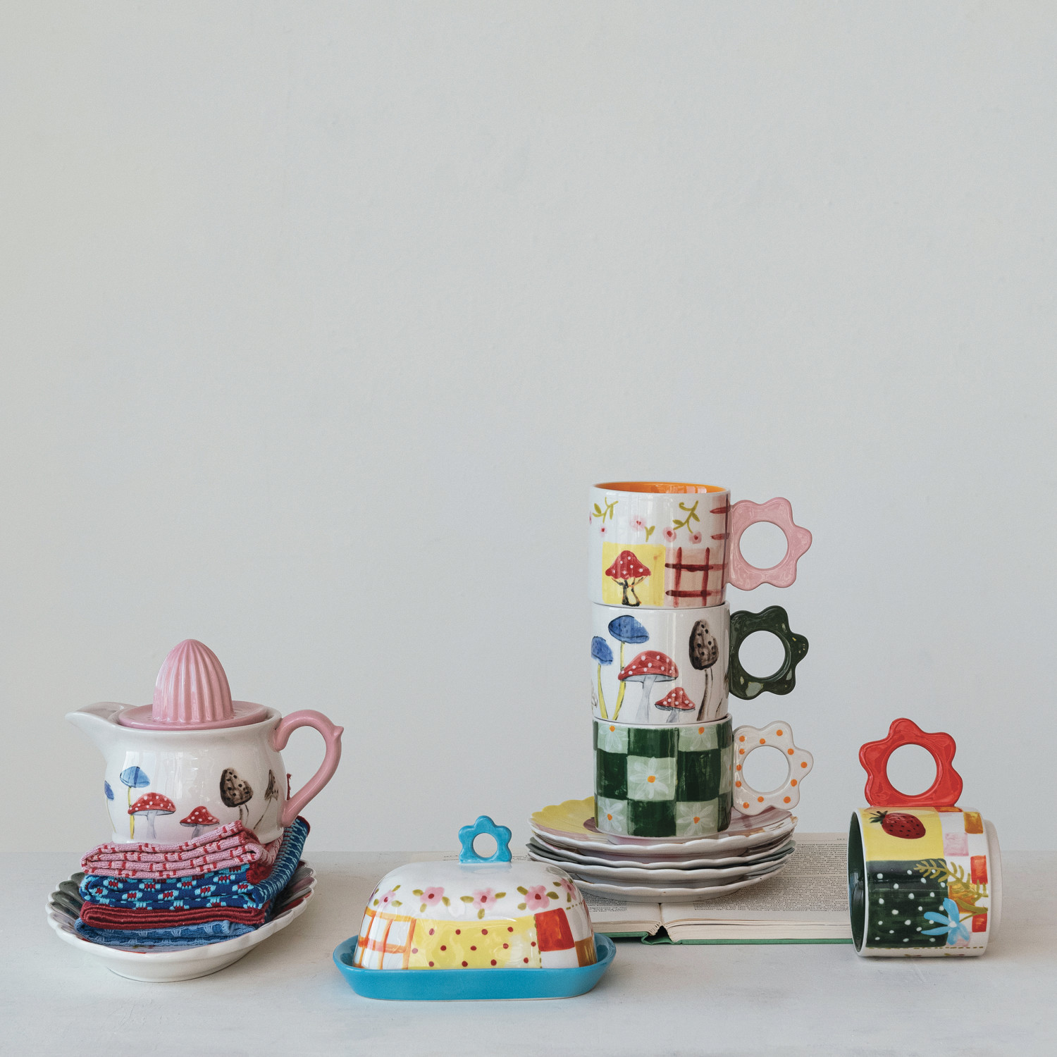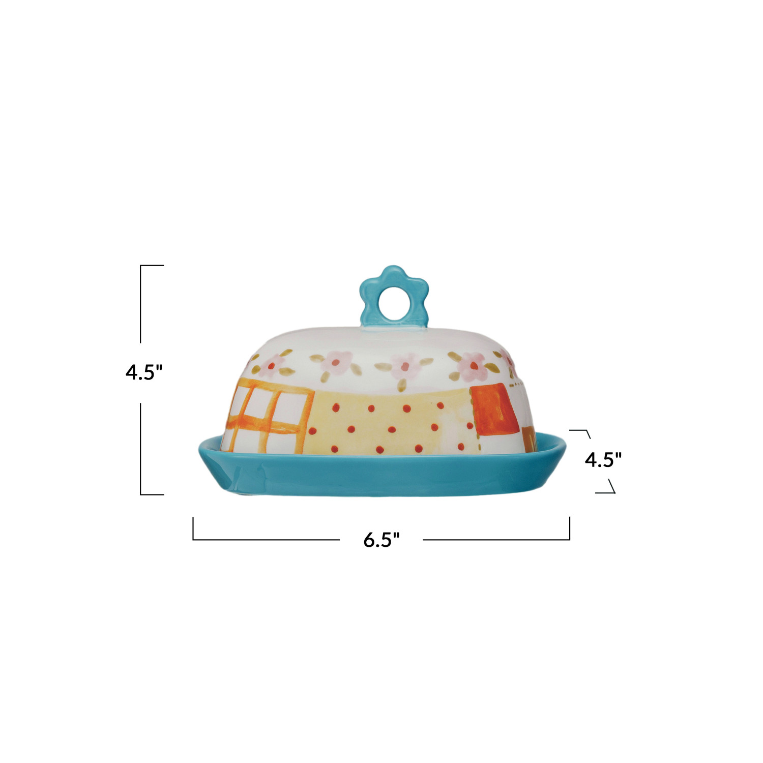 Catalog Name: 6-1/2"L x 4-1/2"W x 4-1/2"H Hand-Painted Stoneware Butter Dish w/ Pattern & Flower Shaped Handle, Multi Color