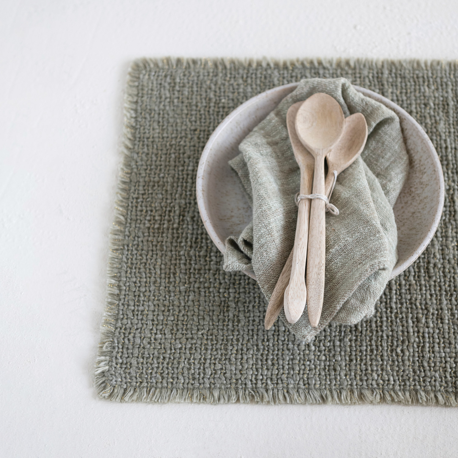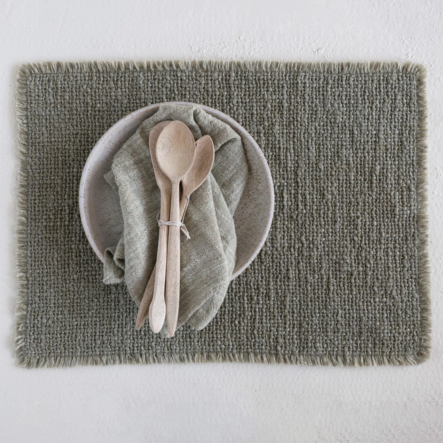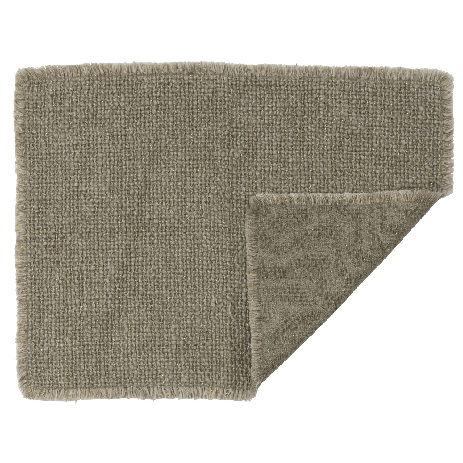 Catalog Name: 19"L x 13"W Woven Cotton Blend Placemat w/ Metallic Thread & Fringe, Olive Green