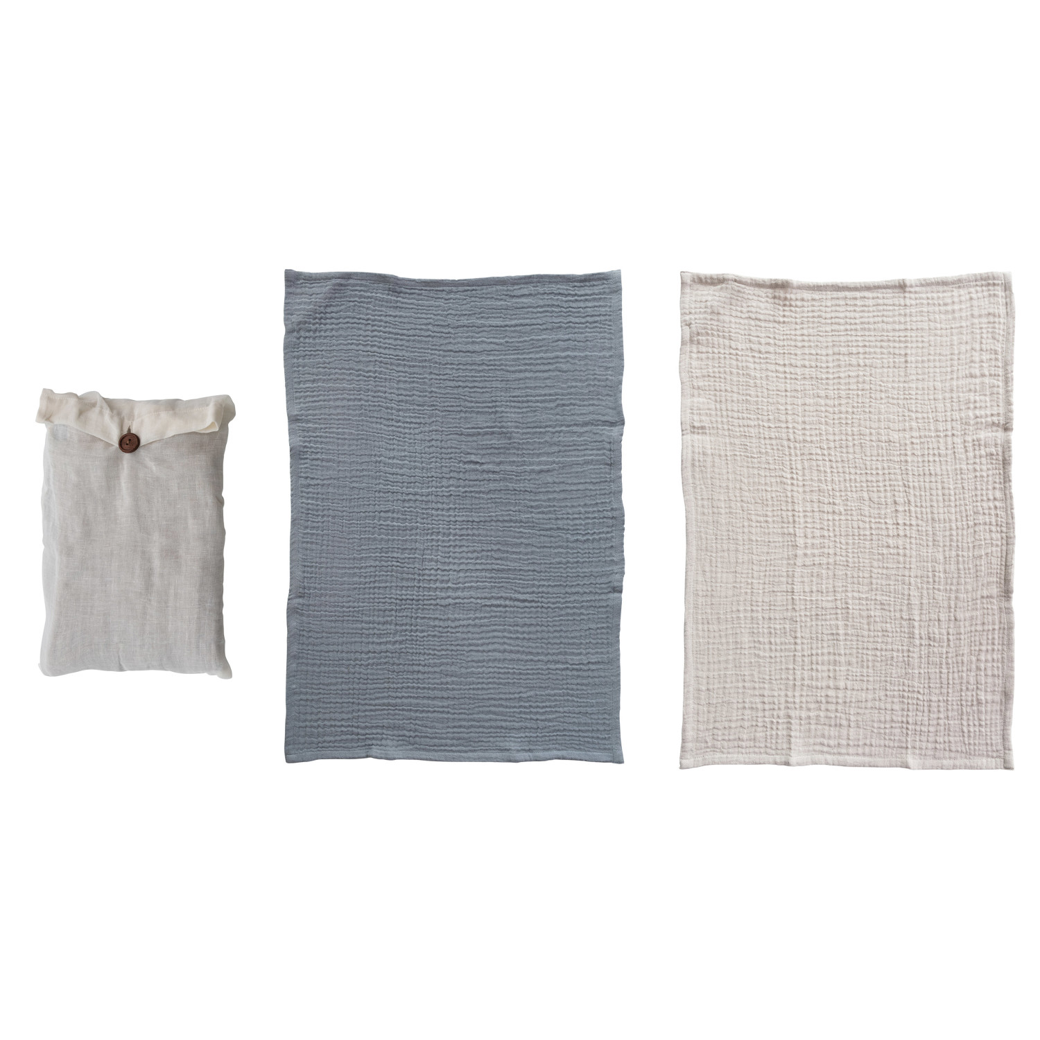This elegant set of cotton double cloth tea towels features 2 timeless hues and a stylish storage bag. Machine Wash Warm, Gentle Cycle, Do Not Bleach, Tumble Dry Low, Warm Iron if Needed.