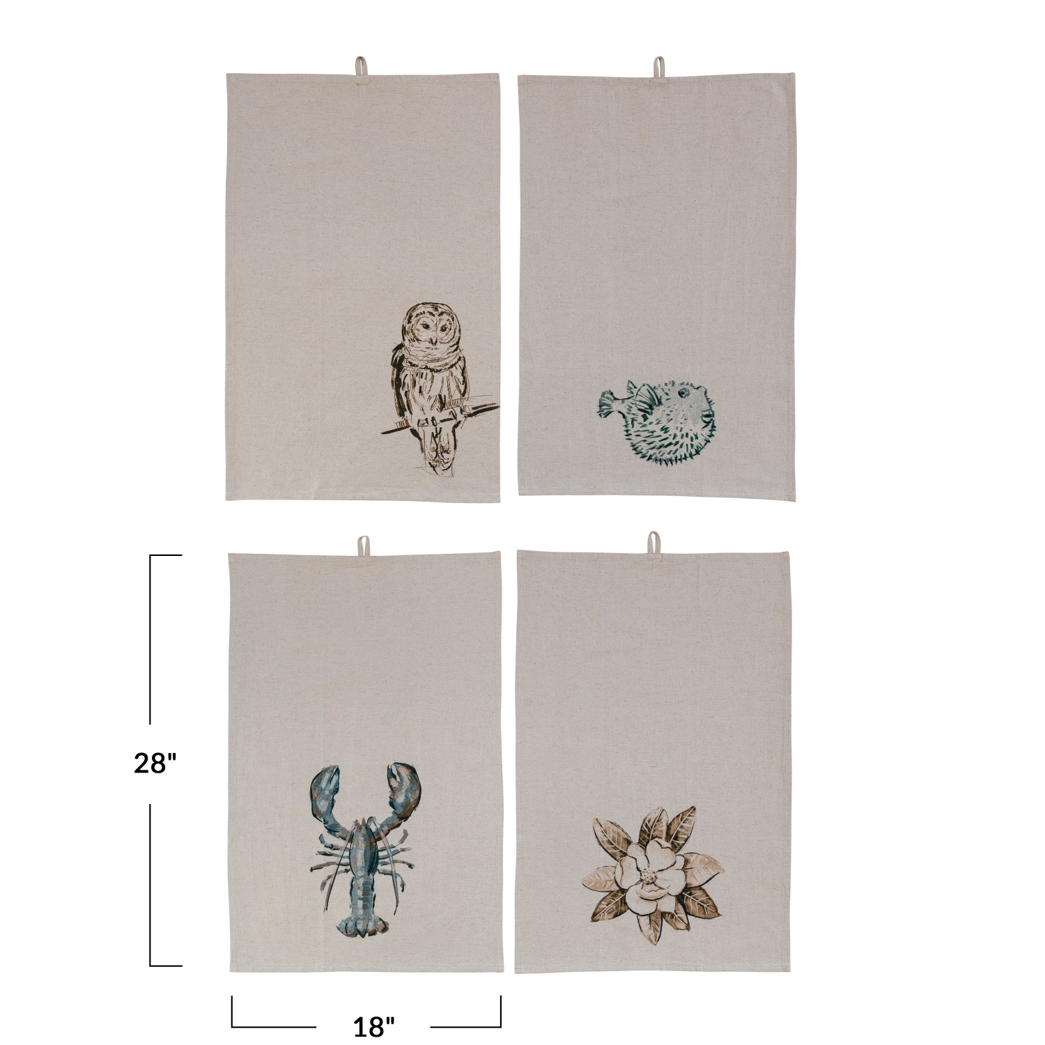 Catalog Name: 28"L x 18"W Cotton & Linen Printed Tea Towel w/ Flora/Fauna Image, Multi Color, 4 Styles ©