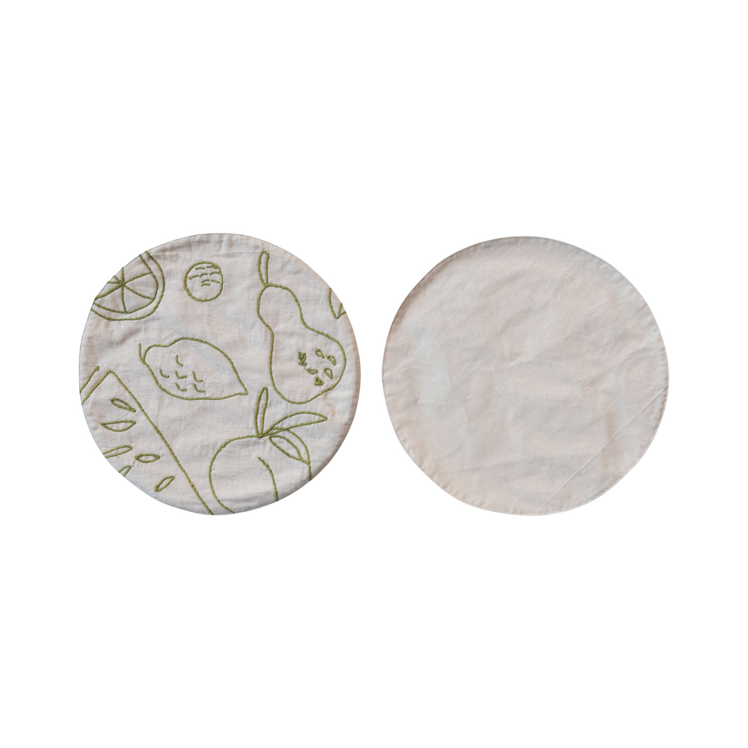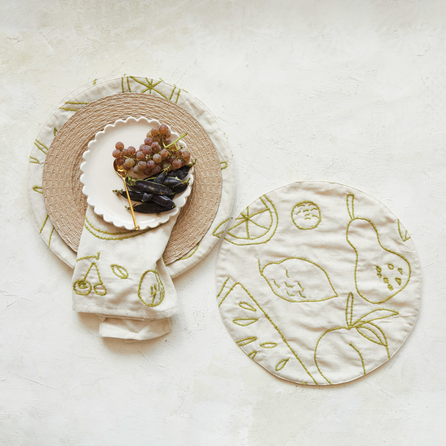 Catalog Name: 15" Round Woven Cotton & Linen Embroidered Placemat w/ Fruit, Natural & Green