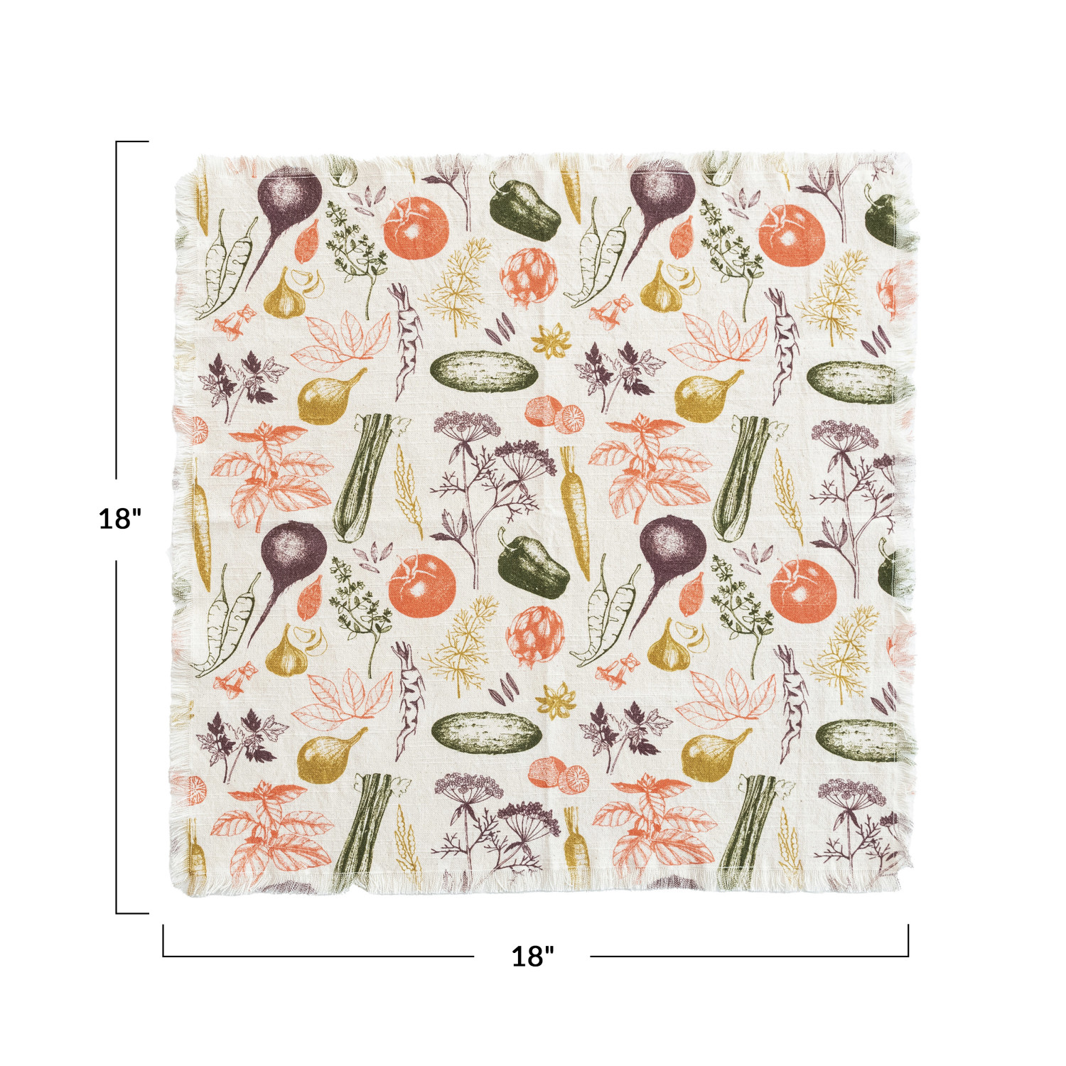 Add these colorful Vegetable-printed Napkins to the dining essentials and bring a cheerful, rustic charm to the table. The playful fringe adds a casual flair, making them suitable for everyday meals or special gatherings. Crafted from cotton slub, they offer a soft, tactile experience, and the square shape ensures they are as practical as they are pretty. It measures 18.0 inches in length and 18.0 inches in width, providing substantial size for individual use. Perfect for a farmhouse-inspired setting, an industrial-chic look, or a rustic ambiance, these napkins are a delightful nod to nature's bounty.