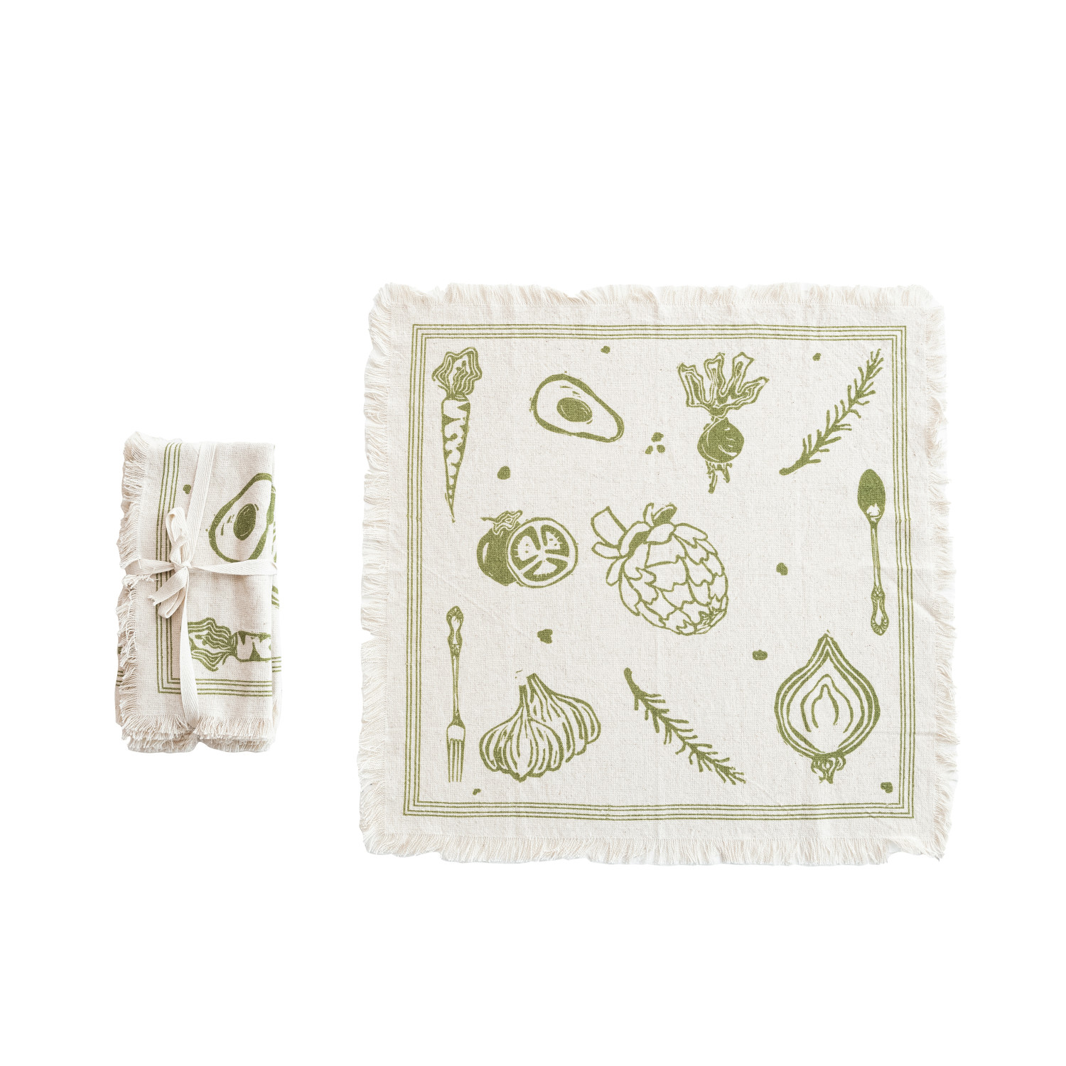 Catalog Name: 18" Square Cotton & Linen Printed Napkins w/ Vegetable/Cutlery Pattern & Fringe, Natural & Green, Set of 4 Tied w/ Cotton Tape