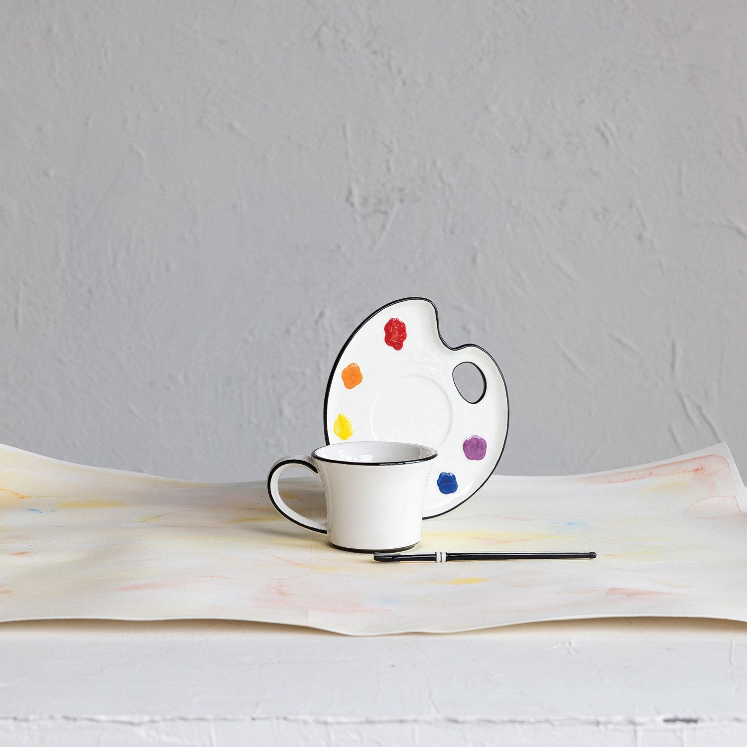 Ceramic Paint Palette Saucer w/ Teacup & Brush Shaped Stirrer, Set of 3