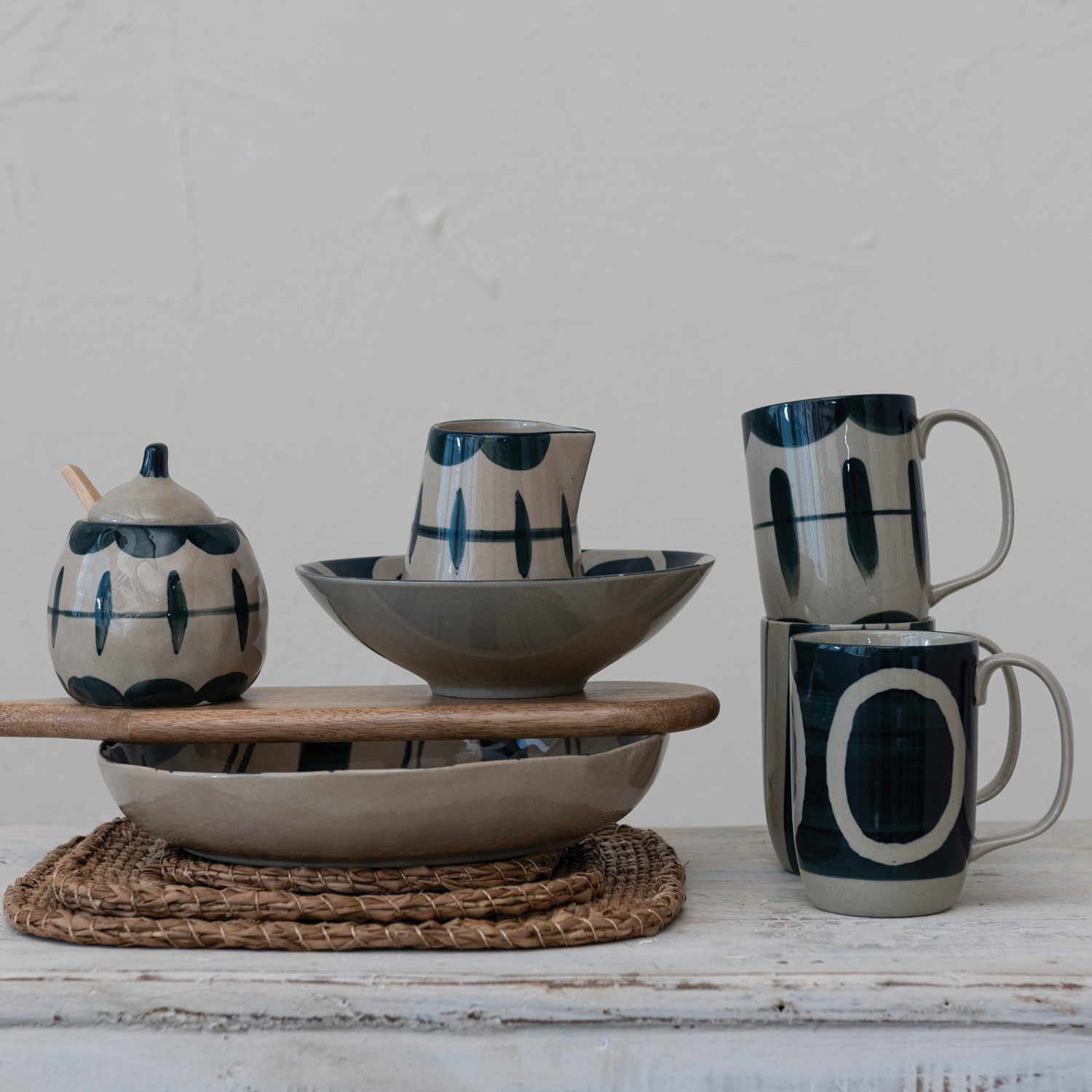 Our thoughtfully crafted collection of serve ware showcases an expansive selection of natural materials and artisanal silhouettes that are all intentionally designed for the modern host. Elevate gatherings of friends and family with an offering of stylishly versatile pieces including serving bowls, pitchers, platters, crocks, ladles, salt and pepper shakers, pinch pots, tiered trays, creamers, appetizer boards, serving trays, so much more. Choose from a wide array of materials from marble to wood, and styles from rustic and modern to farmhouse and glam. Curate a dazzlingly elegant display for a dinner party, or simply add a touch of style to daily rituals with a piece that is sure to impress. This farmhouse-inspired stoneware serving bowl features intricately hand-painted stripes. This piece is food safe. Dishwasher safe. Made from stoneware.