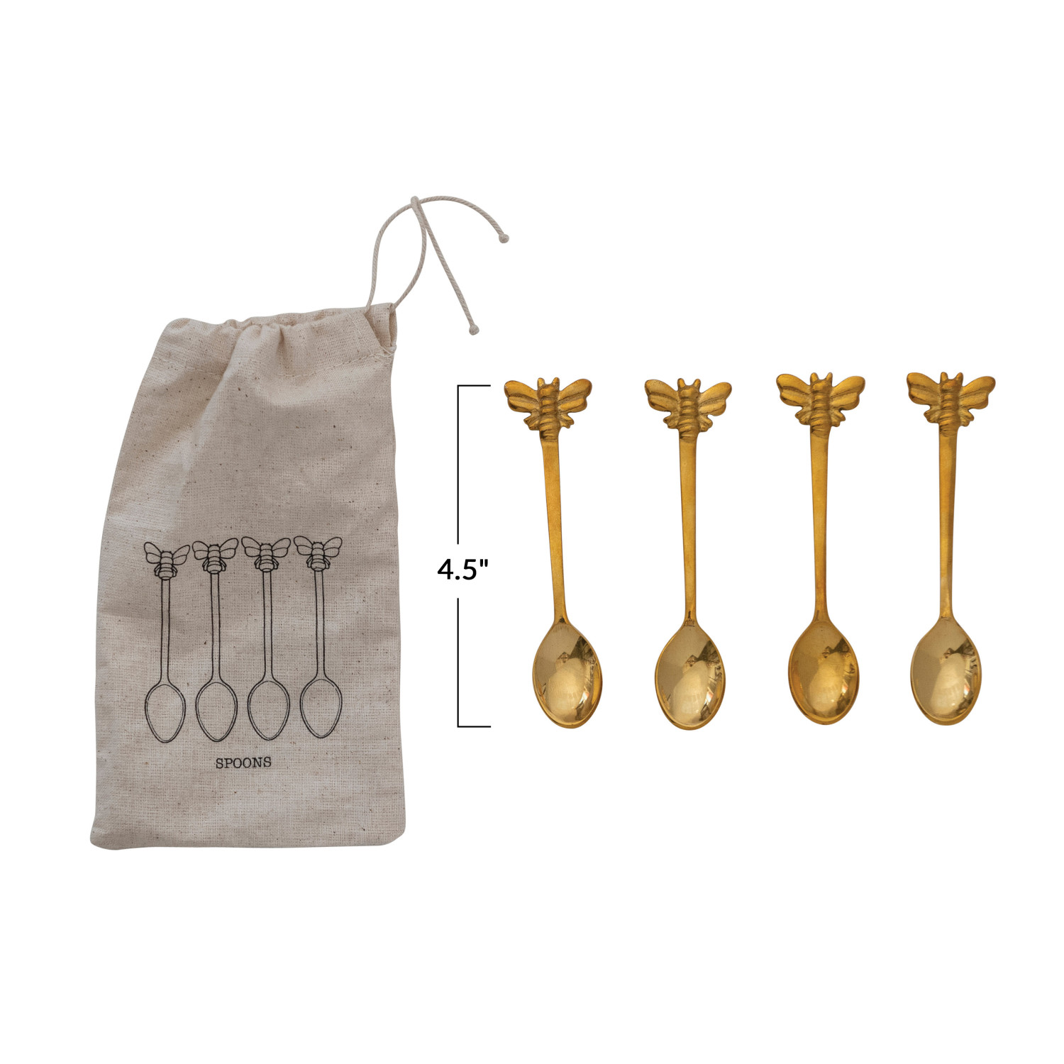 Catalog Name: 4-1/2"L Brass Spoons w/ Bee Handles, Set of 4 in Printed Drawstring Bag
