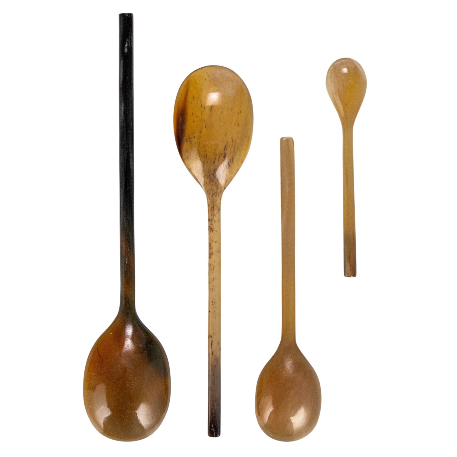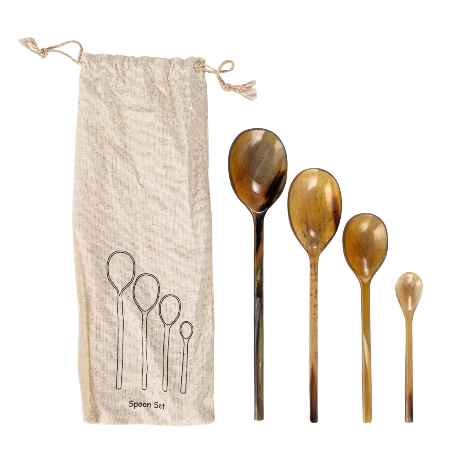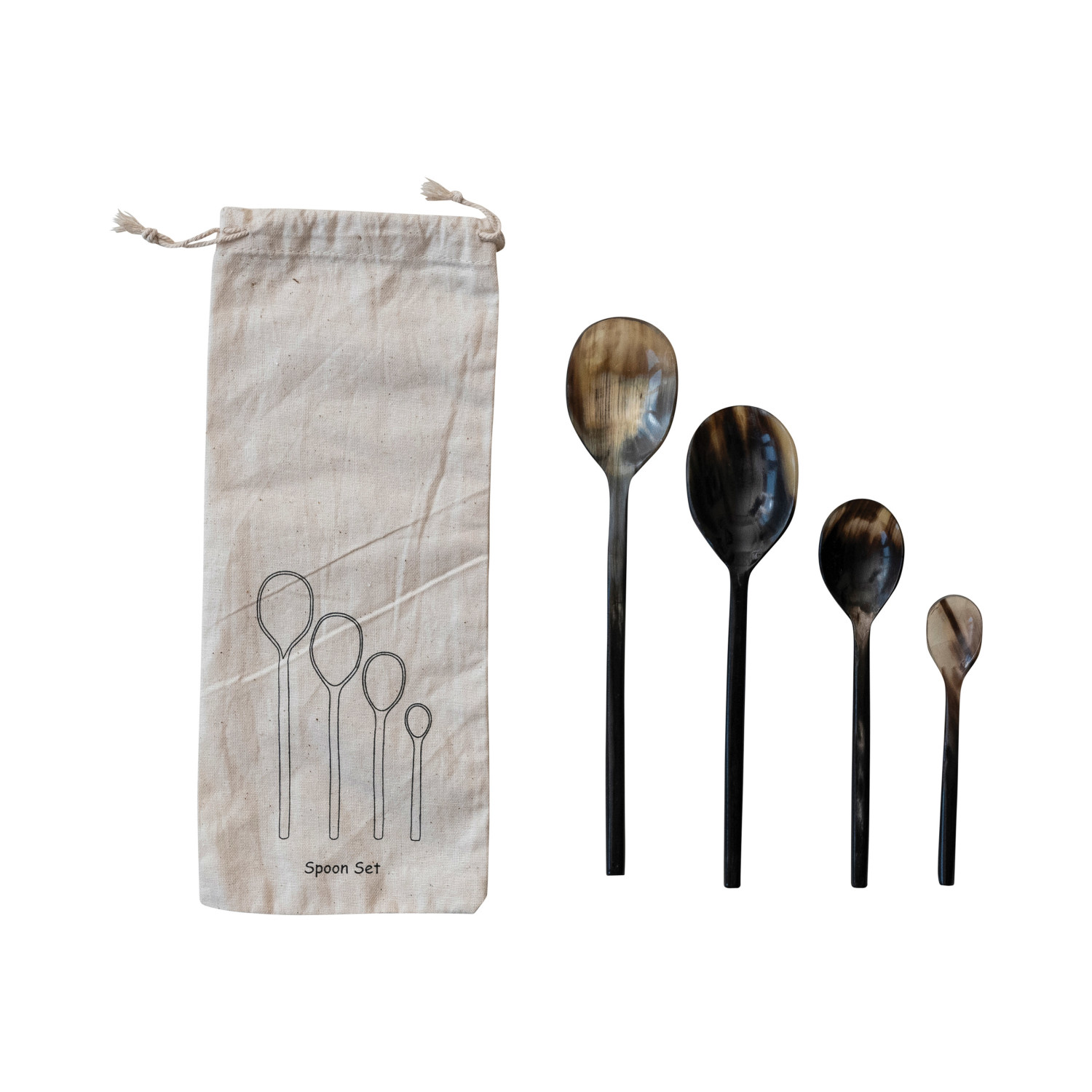 Catalog Name: 4"L - 7-3/4"L Natural Horn Spoons, Set of 4 in Printed Drawstring Bag (Each One Will Vary)