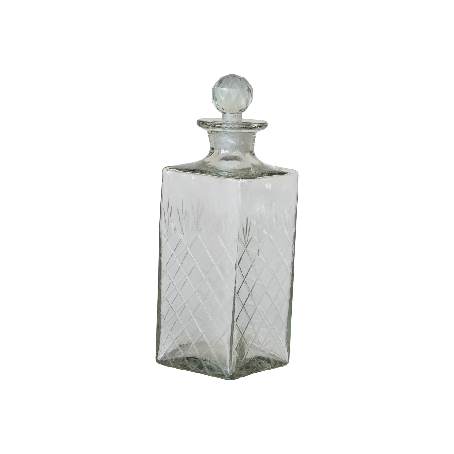Catalog Name: 3-1/4" Square x 10"H 30 oz. Recycled Etched Glass Decanter w/ Glass Stopper