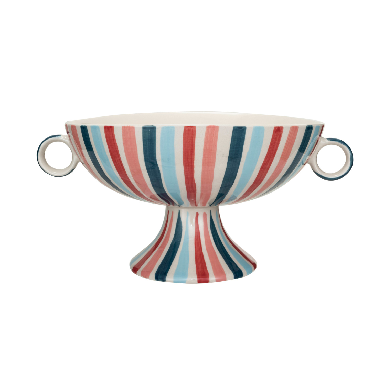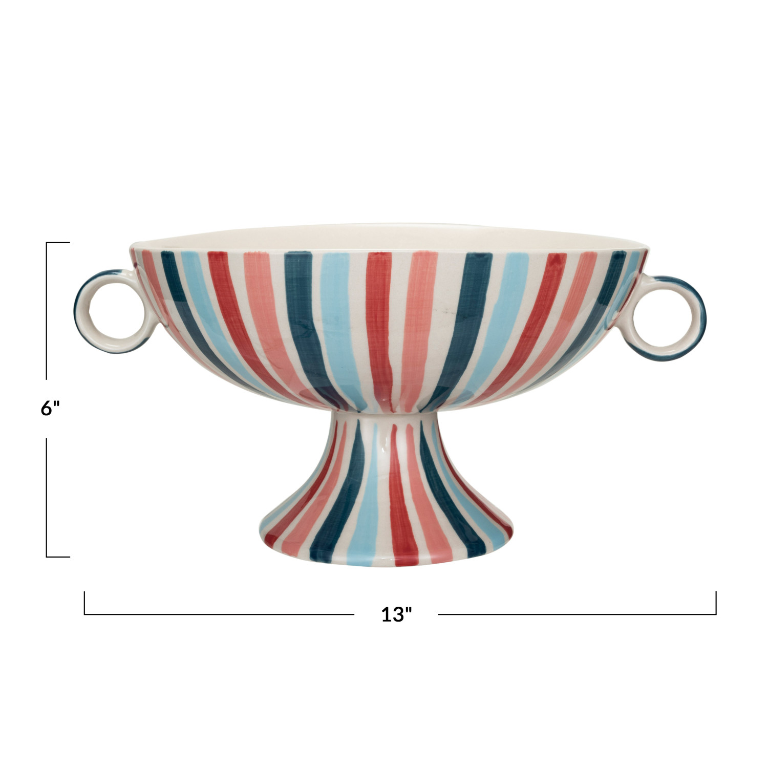 This multi-color hand-painted stoneware footed bowl with handles and stripes is a perfect addition to the serveware collection. This bowl has a colorful and cheerful design that features a footed base, two handles, and hand-painted stripes in various shades of blue, green, yellow, and red. The bowl has a stoneware material that is sturdy and durable, and a hand-painted finish that creates subtle variations in color and texture, making each bowl unique and special. The bowl is also versatile and can be used for serving various dishes, such as salads, fruits, breads, and more. The bowl can suit any style, from farmhouse to French country to coastal to cottagecore, and add a cozy and inviting touch to the table. The bowl measures 13 inches in length, 10 inches in width, and 8.5 inches in height, making it generous enough to hold a large portion of food. Use it for everyday dining or special occasions, this multi-color hand-painted stoneware footed bowl with handles and stripes will impress the guests and enhance the food presentation.