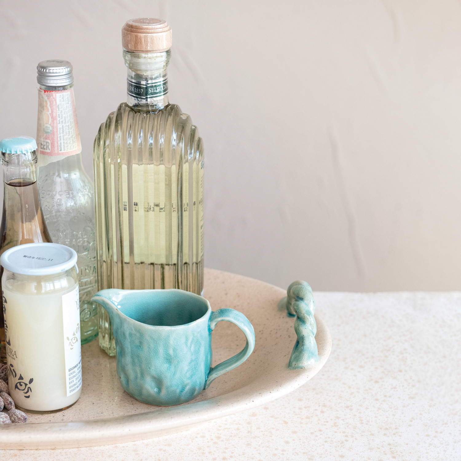 Catalog Name: 19"L x 13-1/4"W x 3-1/2"H Terra-cotta Platter w/ Hand-Painted Twisted Handles, Crackle Glaze, Beige & Aqua (Each One Will Vary)