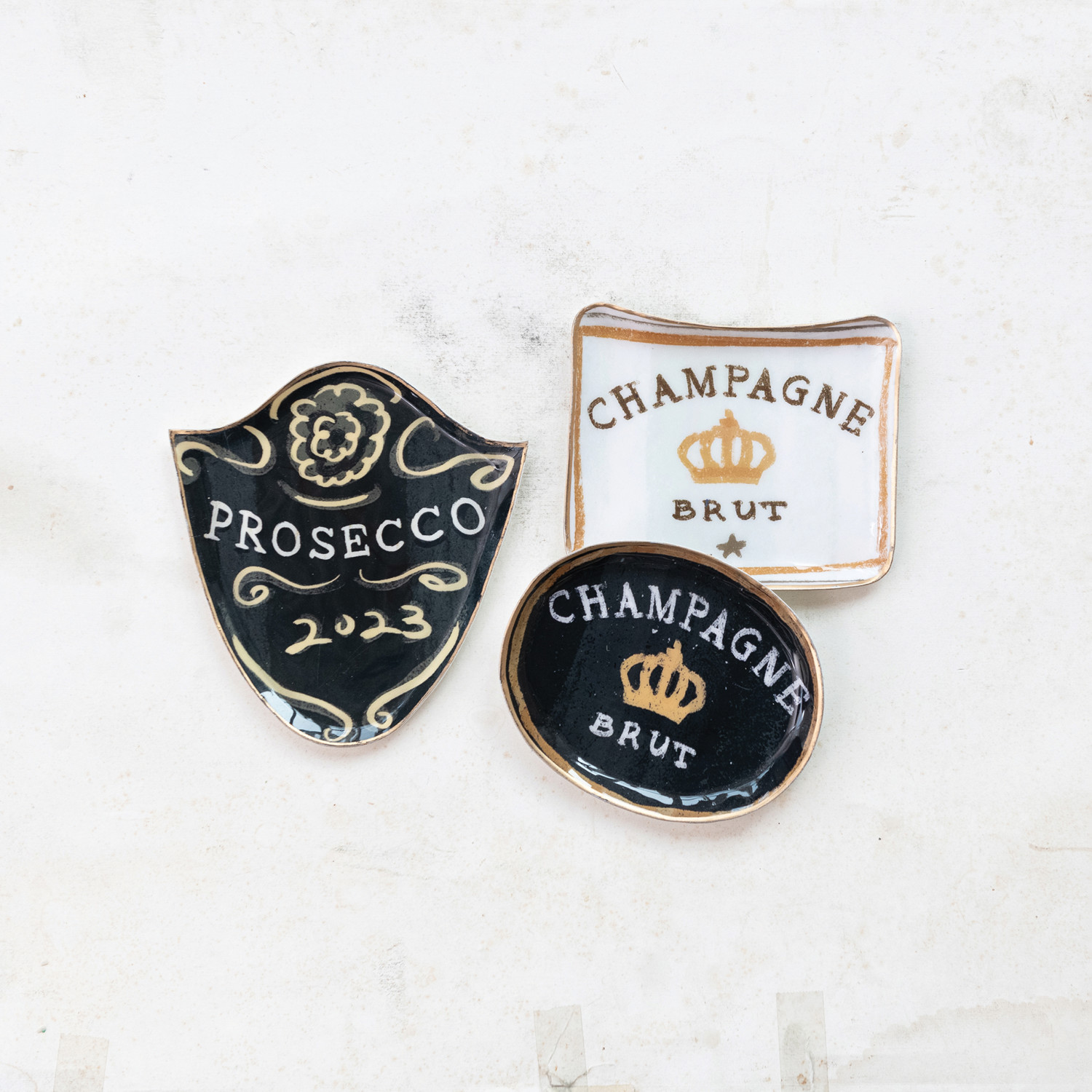 Catalog Name: 6"L x 5-3/4"W Enameled Metal Tray w/ Gold Edge "Prosecco"/"Champagne", 3 Styles ©