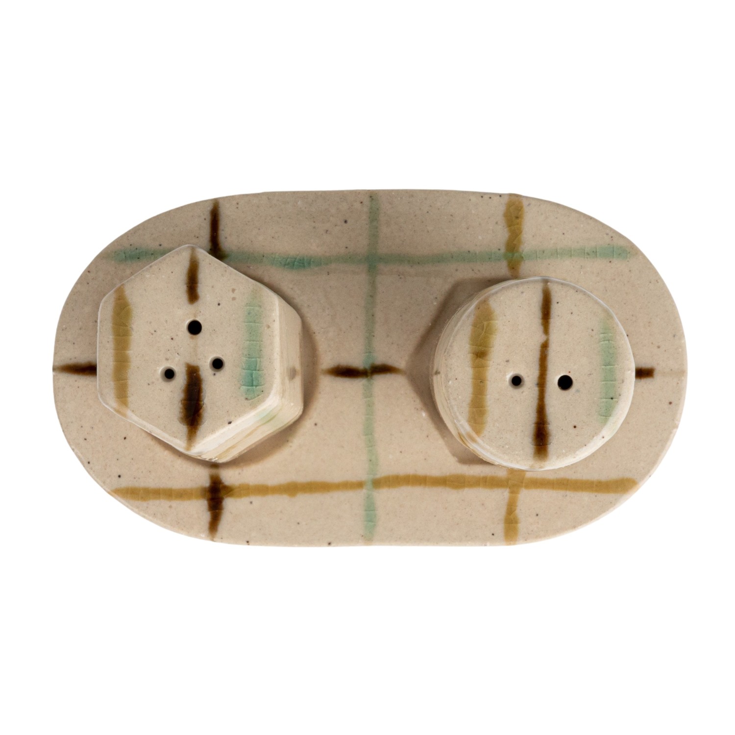 Catalog Name: 4-3/4"L x 2-3/4"W x 3-1/4"H Hand-Painted Stoneware Salt & Pepper Shakers w/ Grid Pattern & Tray, Reactive Crackle Glaze, Multi Color, Set of 3 (Each One Will Vary)