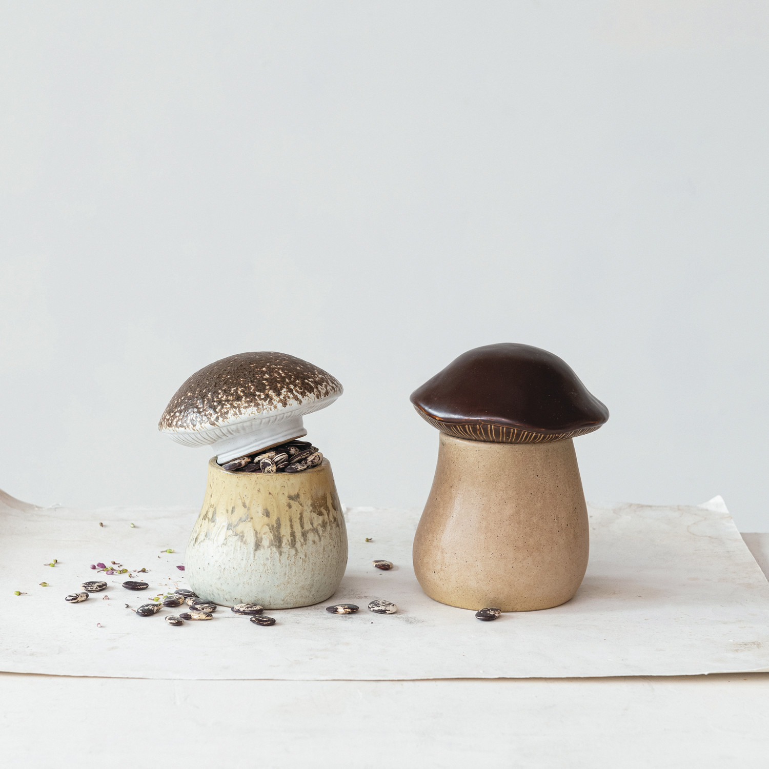 Catalog Name: 5-3/4" Round x 7"H Stoneware Mushroom Canister, Reactive Glaze, Brown & Tan Color (Each One Will Vary)