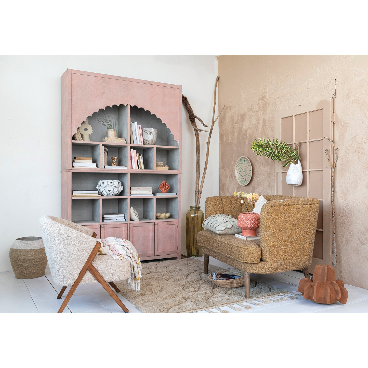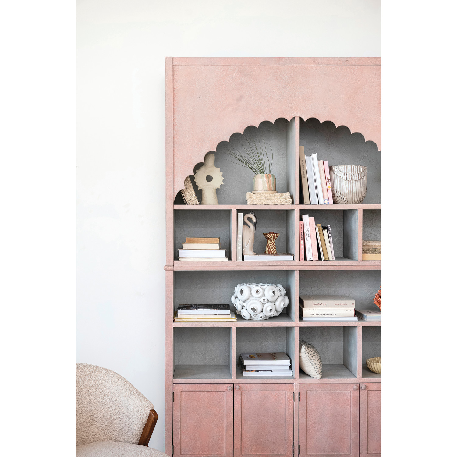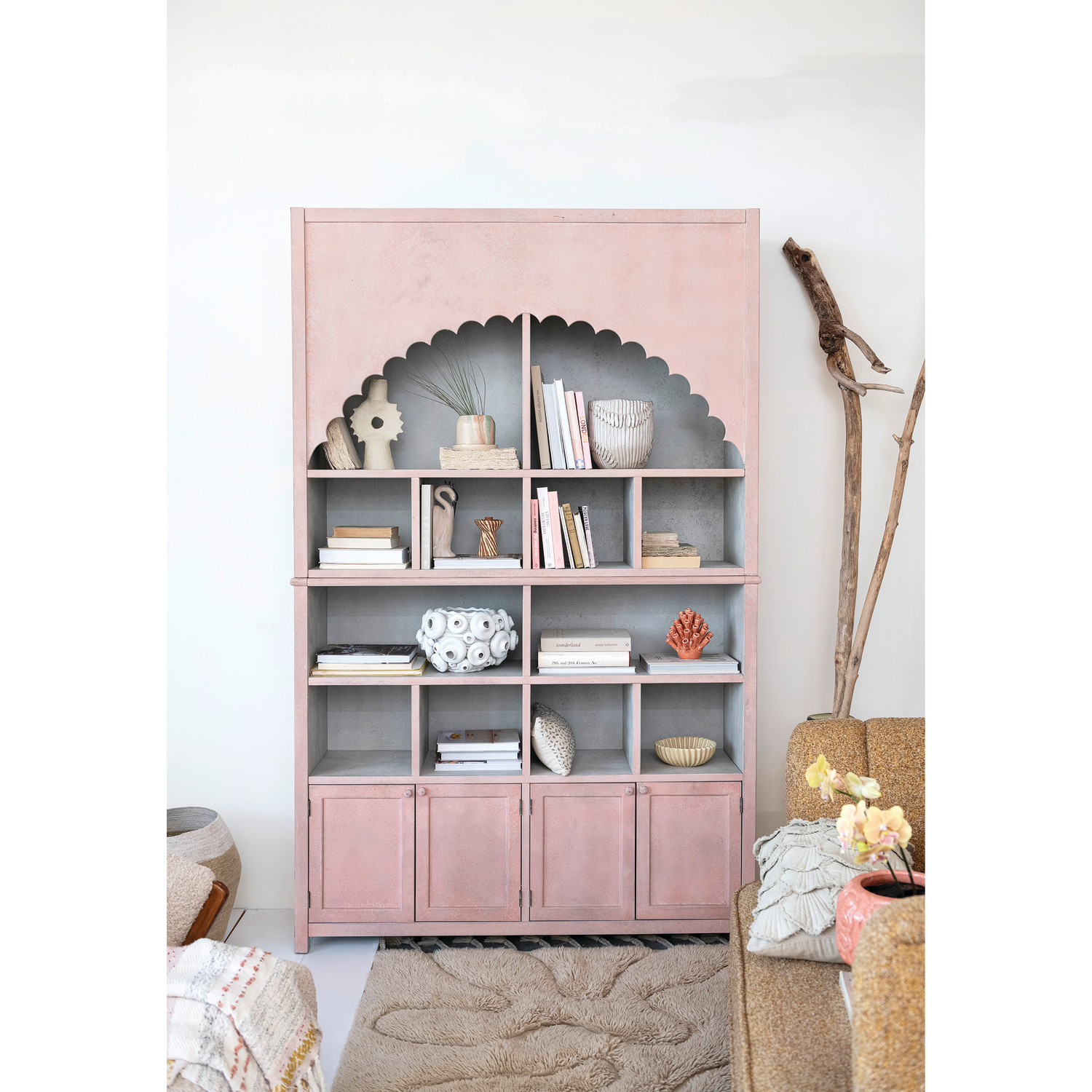 This wood cabinet with a scalloped edge is a beautiful and functional piece of furniture that will enhance any room. It is crafted from high-quality wood that has a stunning antique pink finish that adds warmth and character to the cabinet. The cabinet has a scalloped edge along the top that gives it a unique and elegant shape. The cabinet has 14 compartments that are divided by shelves and doors. The doors also have knobs that make them easy to open and close. The cabinet offers ample storage space for items, display books, dishes, collectibles, or other things. The cabinet measures 59.5 inches in length, 15.75 inches in width, and 94.5 inches in height, making it a substantial and impressive piece of furniture. This wood cabinet with a scalloped edge is a perfect choice for adding farmhouse, boho, Scandinavian, French country, or vintage style to the home.