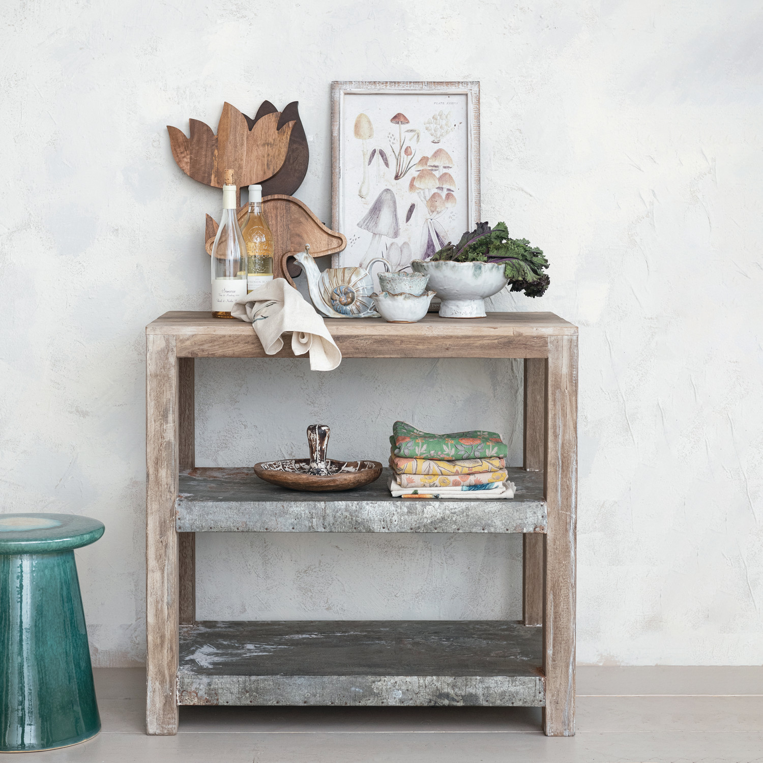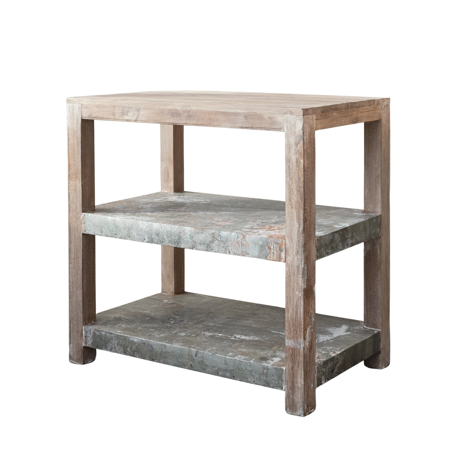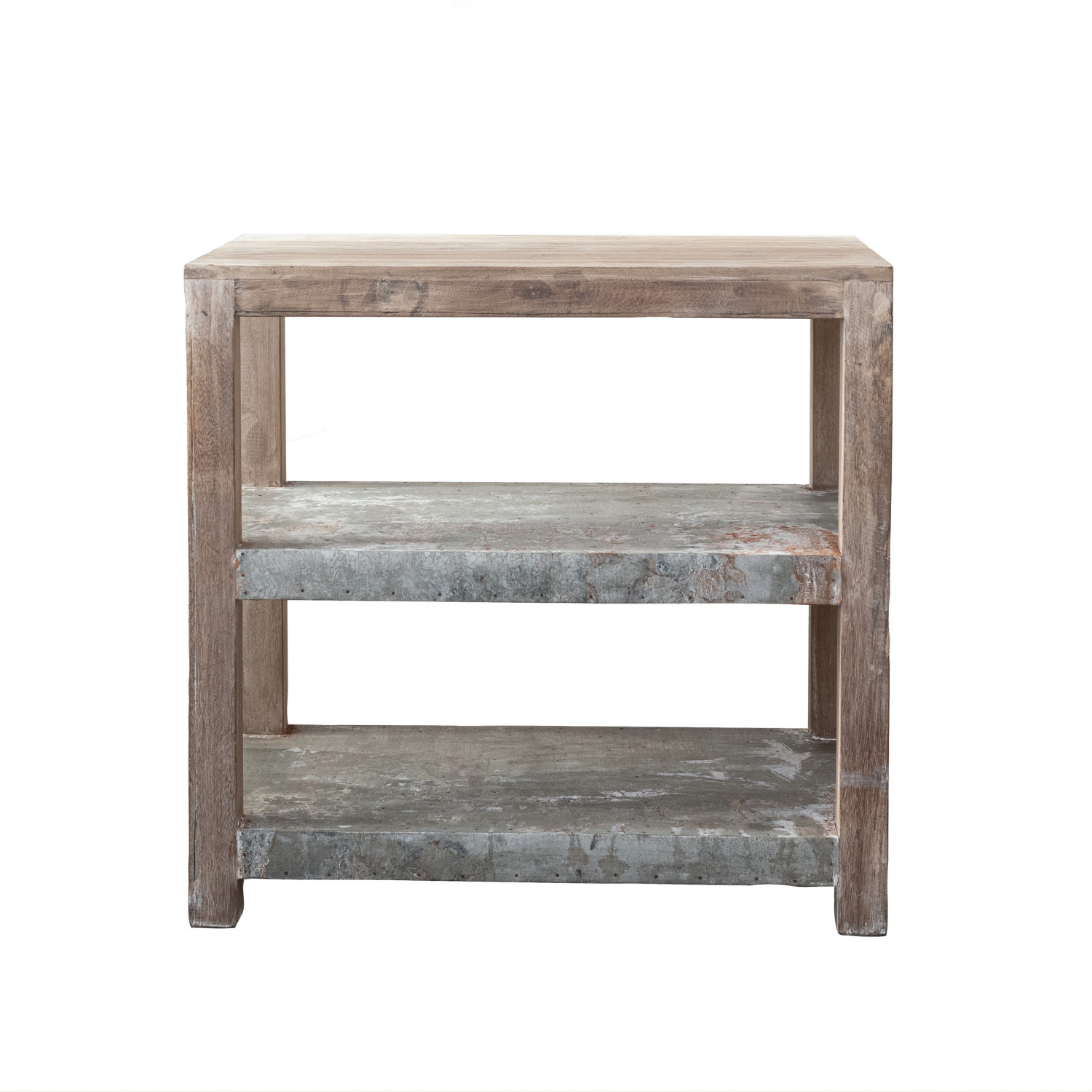 Catalog Name: 35"W x 21"D x 34"H Reclaimed Wood & Metal Clad Shelf w/ 2 Shelves, Sunbleached Finish, Truck Ship (Each One Will Vary)