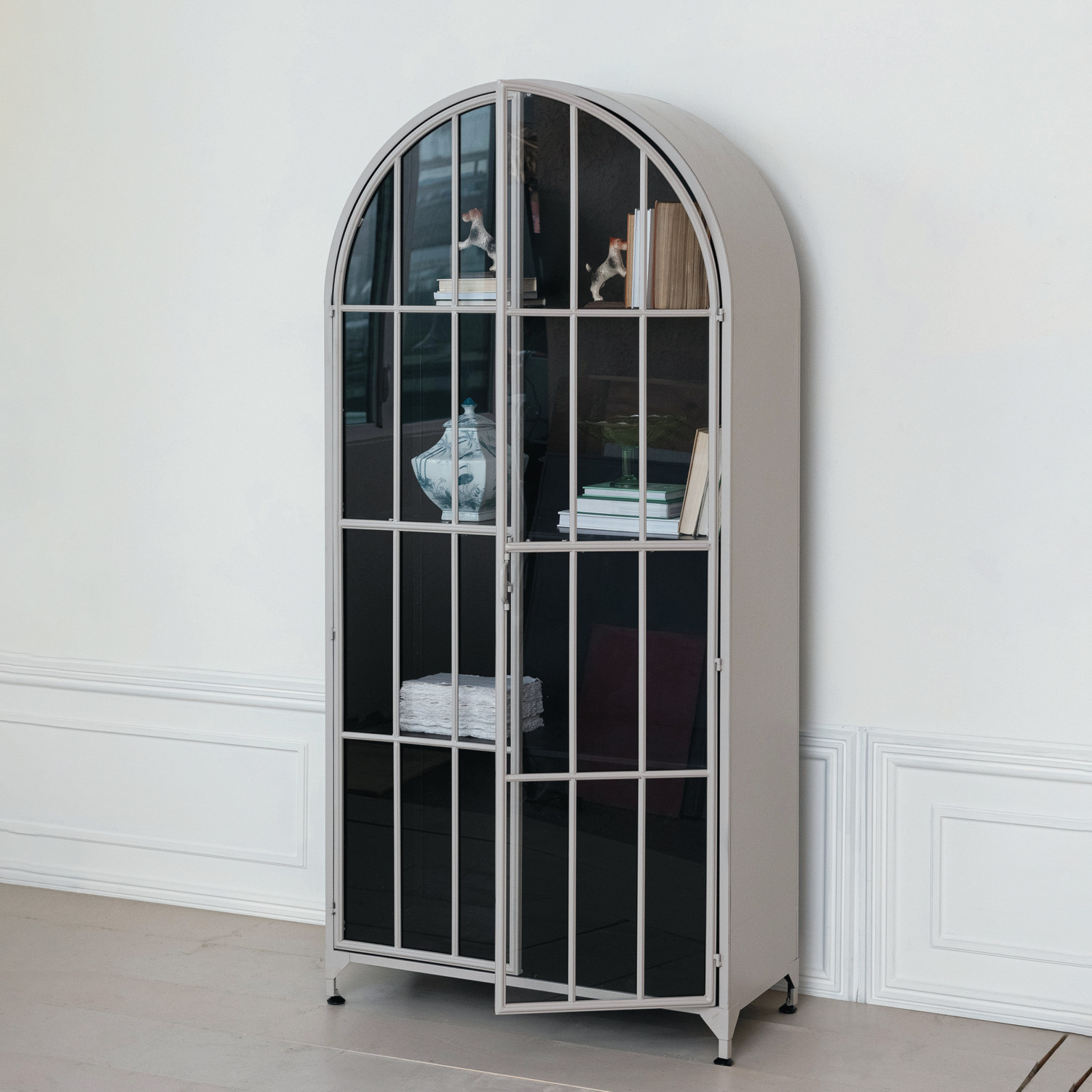 This Modern Grey Arched Metal Cabinet with Glass Shelves stands as a testament to minimalist elegance and functional design. Measuring 36.0 inches wide and 76.7 inches high, it offers three levels of shelving to showcase everything from books to decor. The grey metal frame and arched top bring a contemporary edge to any room, while the glass shelves add a light, airy feel. It's a piece that not only serves a practical purpose but also enhances the aesthetic of a modern, contemporary, or minimalist space. With its sleek and clean lines, this cabinet is sure to complement any decor style. The durable construction ensures that it will stand the test of time in both form and function.