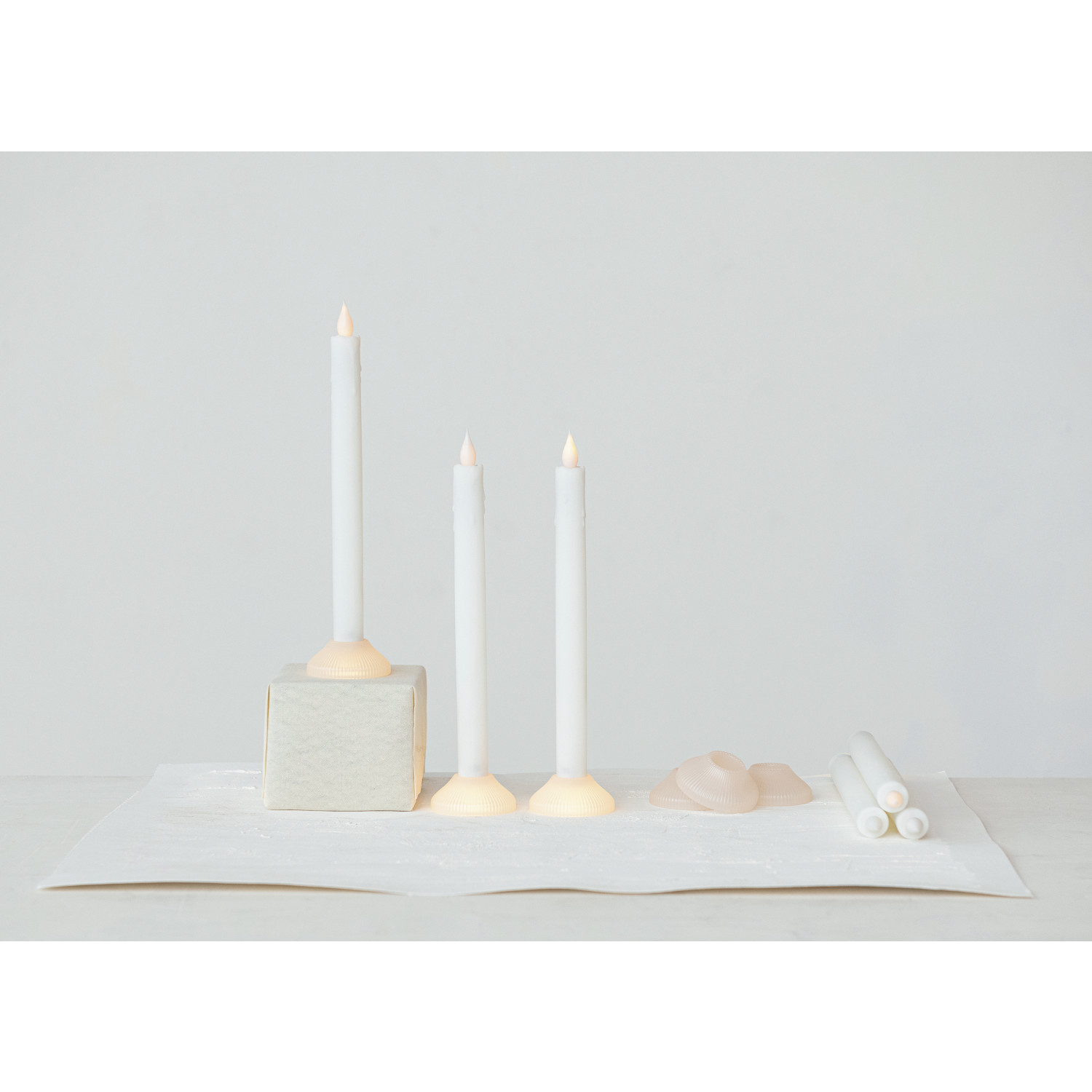 This set of 6 10.0-inch high LED taper candles with an illuminated holder invites a magical ambiance into the home. Crafted from durable white plastic, these battery-operated lights are designed to mimic the charm of real candles without any of the risks. They seamlessly fit into a variety of interior styles, from Cottagecore to French Country, and from Casual to Cabin Bohemian. The round, elegant form factor, combined with the convenience of included batteries, makes these candles a must-have for anyone looking to enhance their space with a warm, inviting glow.