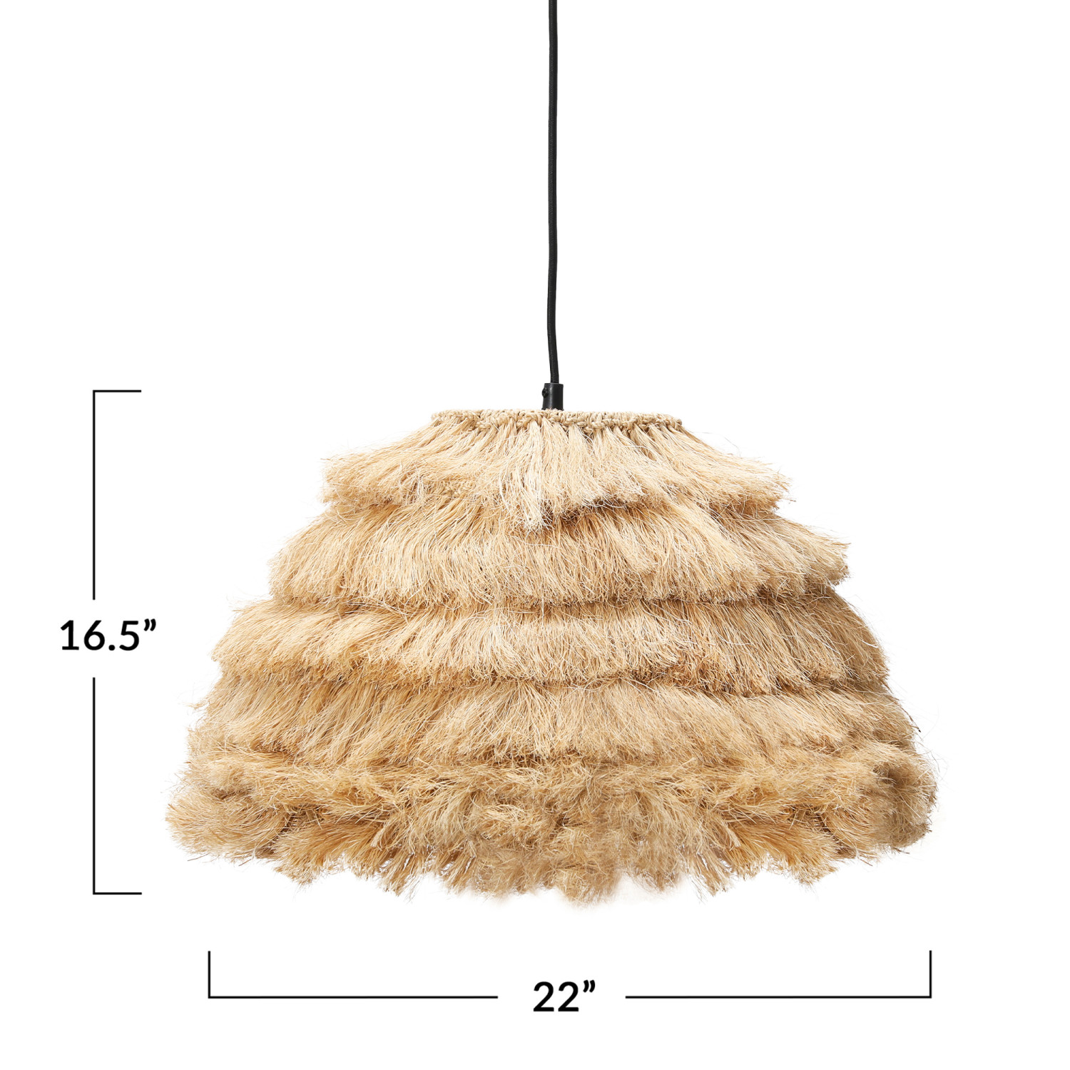 This contemporary, boho-inspired ceiling light showcases an iron base adorned with a fashionable, shaggy shade crafted from all-natural fiber. Natural abaca rope ceiling light with 4' cord. Display this stunning light fixture to instantly elevate any bedroom or gathering space. Maximum 60-watt bulb (not included).