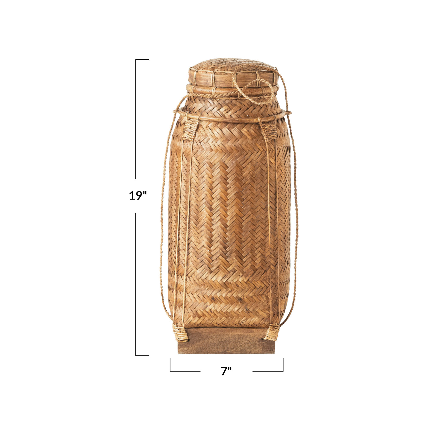 Catalog Name: 7" Round x 19"H Decorative Woven Bamboo, Rattan & Wood Container w/ Lid, Stained Finish