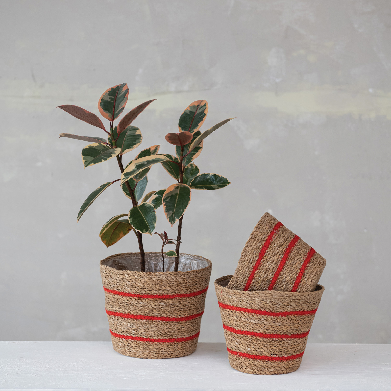 Catalog Name: 9-3/4" Round x 7-3/4"H, 8-3/4" Round x 7"H & 7-3/4" Round x 6-1/4"H Hand-Woven Seagrass & Jute Baskets w/ Stripes & Plastic Lining, Natural & Red, Set of 3