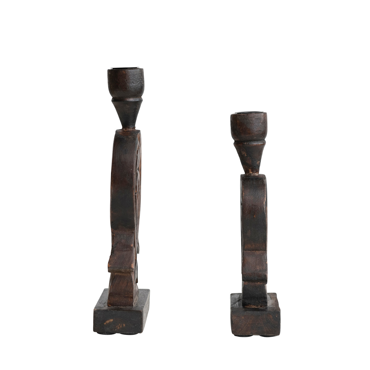Catalog Name: 4"L x 2"W x 10"H & 3-1/2"L x 3-1/2"W x 8-1/2"H Hand-Carved Mango Wood Taper Holders, Walnut Finish, Set of 2