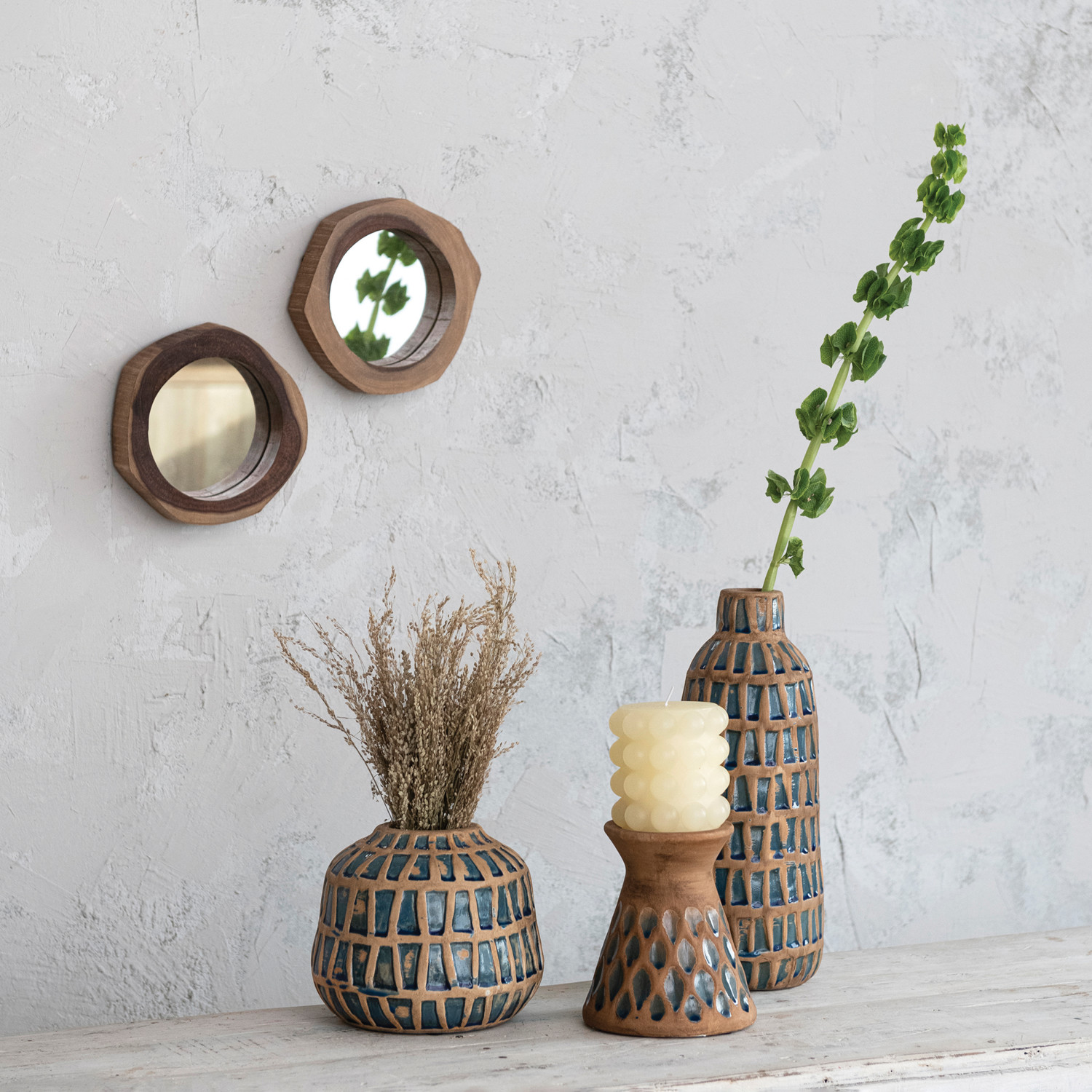 Elegant and versatile, the candle holders offered are more than mere accessories; they serve as expressions of one's style and mood. Crafted from various materials such as metal, glass, and stoneware, these candle holders boast a range of designs that effortlessly complement any decor. With the ability to accommodate an array of candle types, from tea lights to pillars, they prove to be both user-friendly and easy to maintain. Intended for use in any room where the soothing radiance of candles is desired, these holders are thoughtfully designed to elevate the ambiance and create a captivating atmosphere. Whether aiming to cultivate a romantic, cozy, or festive setting, these candle holders are well-equipped to assist. Browse through the exquisite collection to discover the perfect pieces that will illuminate space with elegance and charm. With these candle holders, the home or event will be transformed into a captivating haven. Illuminate any space with the enchanting beauty of this debossed terra-cotta candle pillar holder with natural and blue tones intertwining on the textured surface, creating a captivating visual display. Complements various interior design styles, from rustic and coastal to bohemian and eclectic. The holder is designed specifically for 3-inch pillar candles, providing a secure and stylish platform for showcasing any favorite candles. Made of terra-cotta.