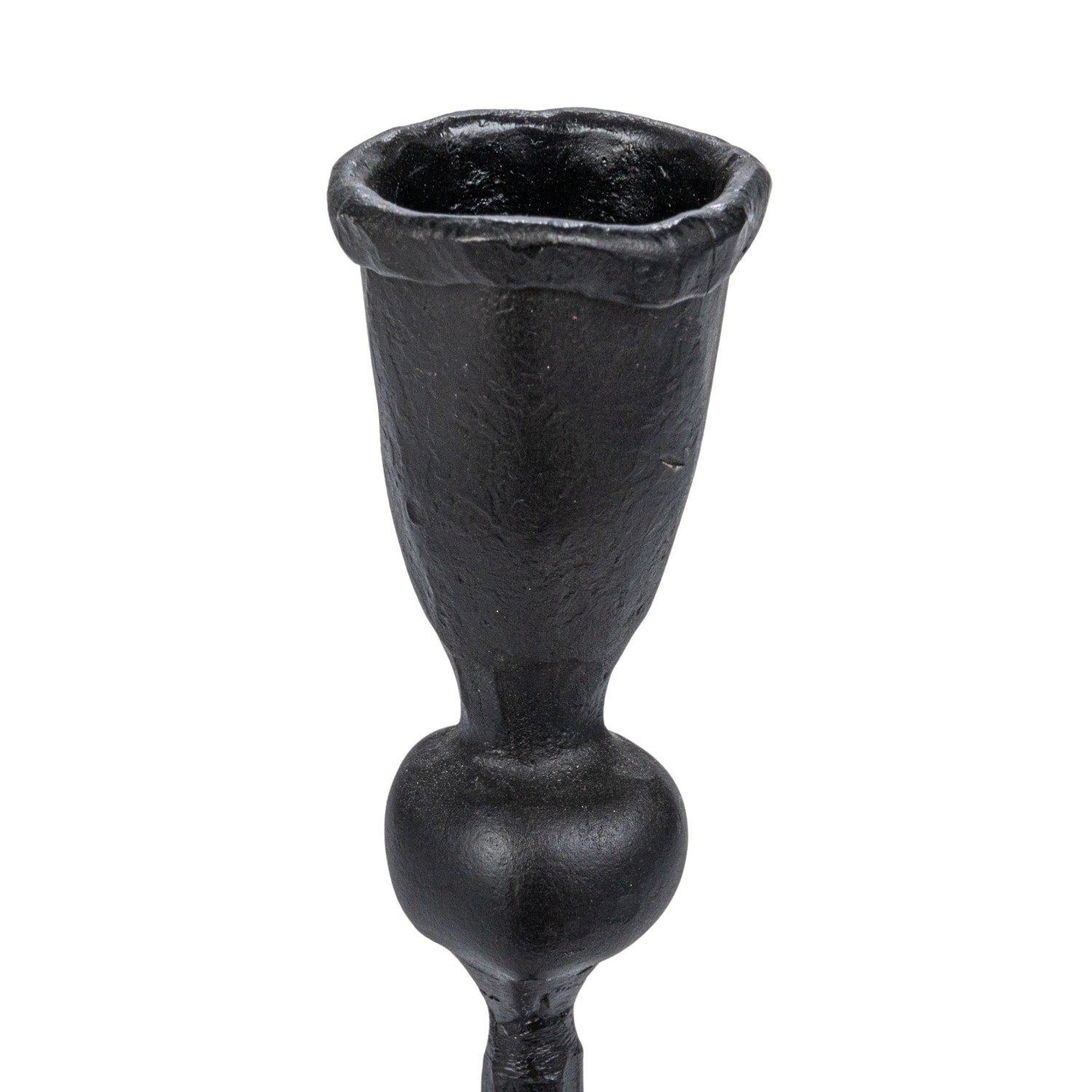 This taper holder is a beautiful and functional piece that will enhance the home with its rustic charm. The taper holder is hand-forged metal, shaped, and hammered by skilled artisans. The metal has a black finish that adds contrast and depth to the space. The taper holder has a round base and a slender stem that can hold most standard taper candles. Place this on any surface or setting, creating a cozy and inviting ambiance with its subtle light. Whether used for decoration or illumination, this taper holder will add a touch of sophistication and simplicity to the space. It measures 3.75 inches in diameter and 12 inches in height, suitable for holding most standard taper candles. This candle holder is the perfect way to add color and charm to any room.