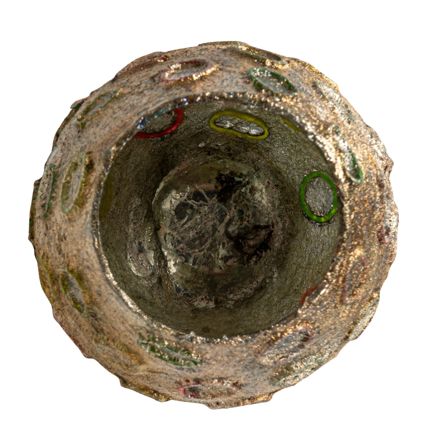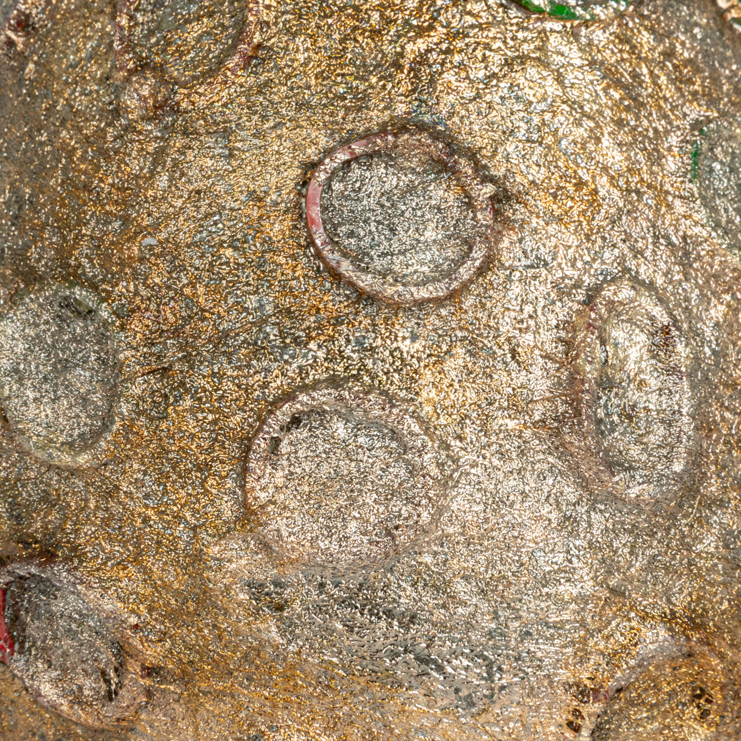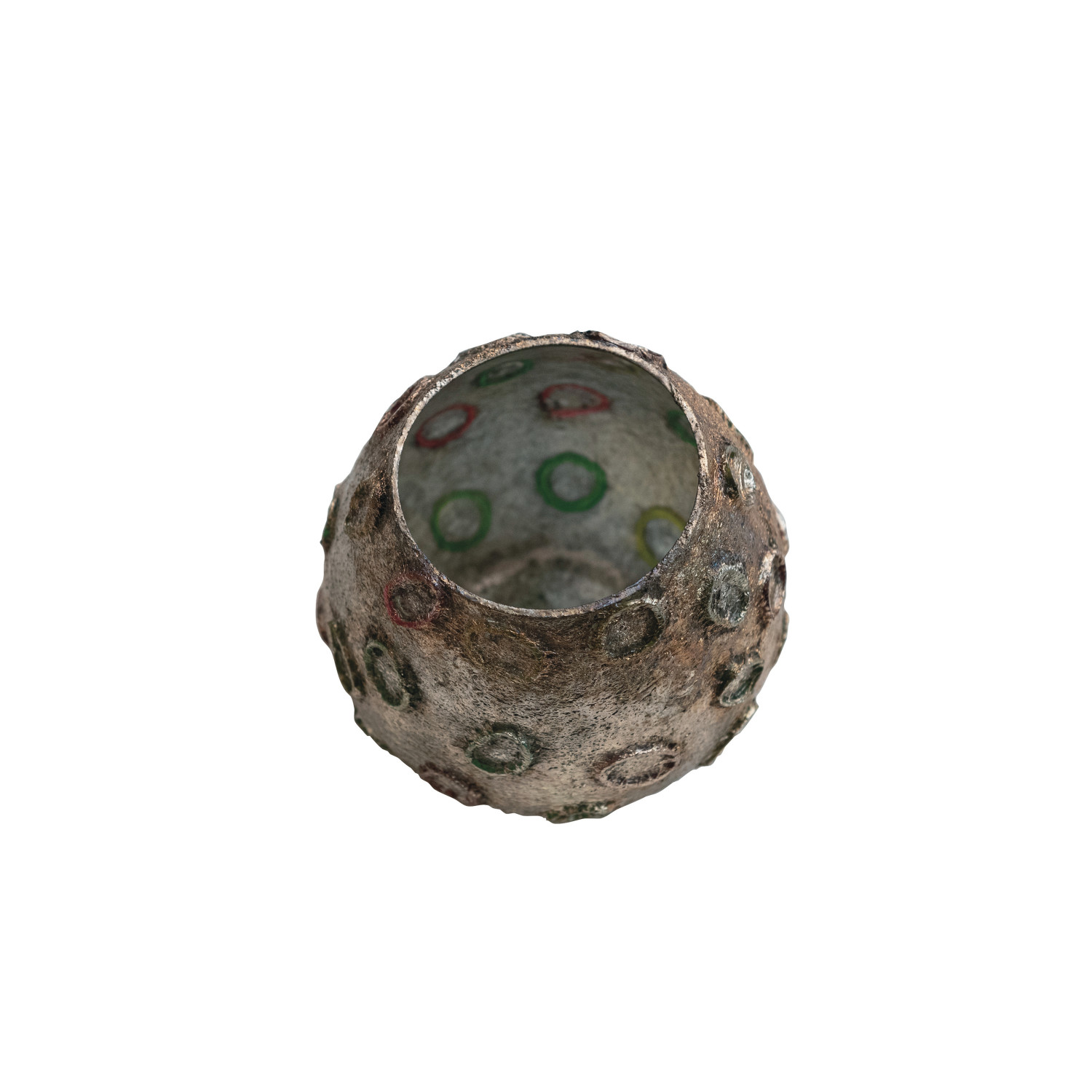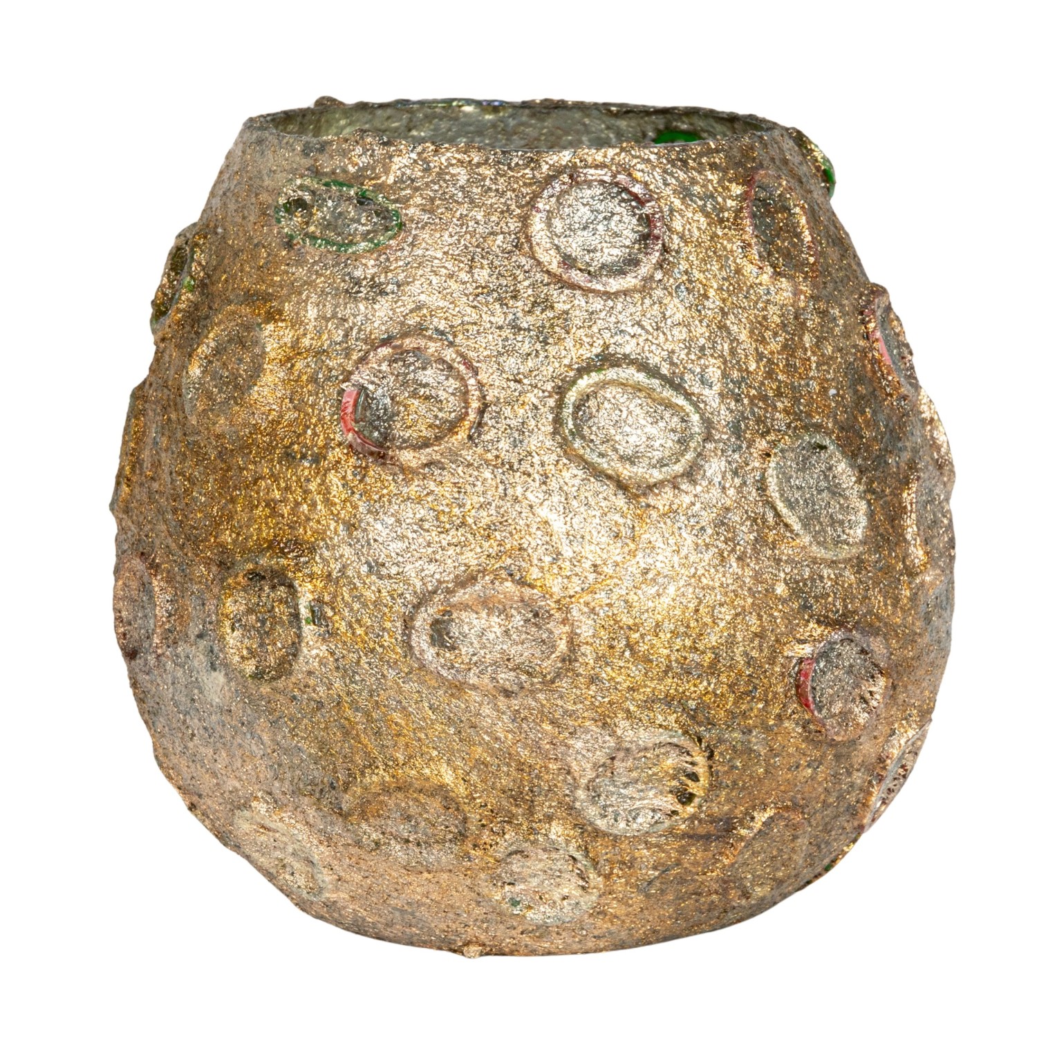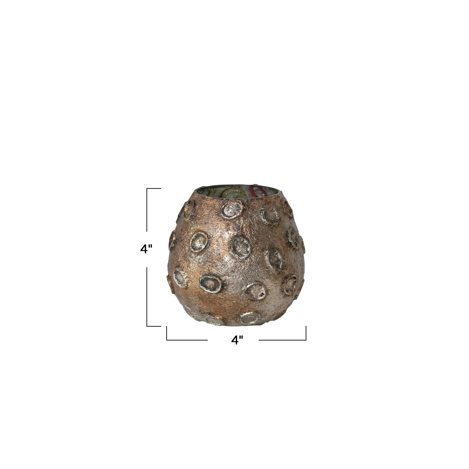 Catalog Name: 4" Round x 4"H Glass Tealight/Votive Holder w/ Embossed Rubber Band Circles, Metallic Finish