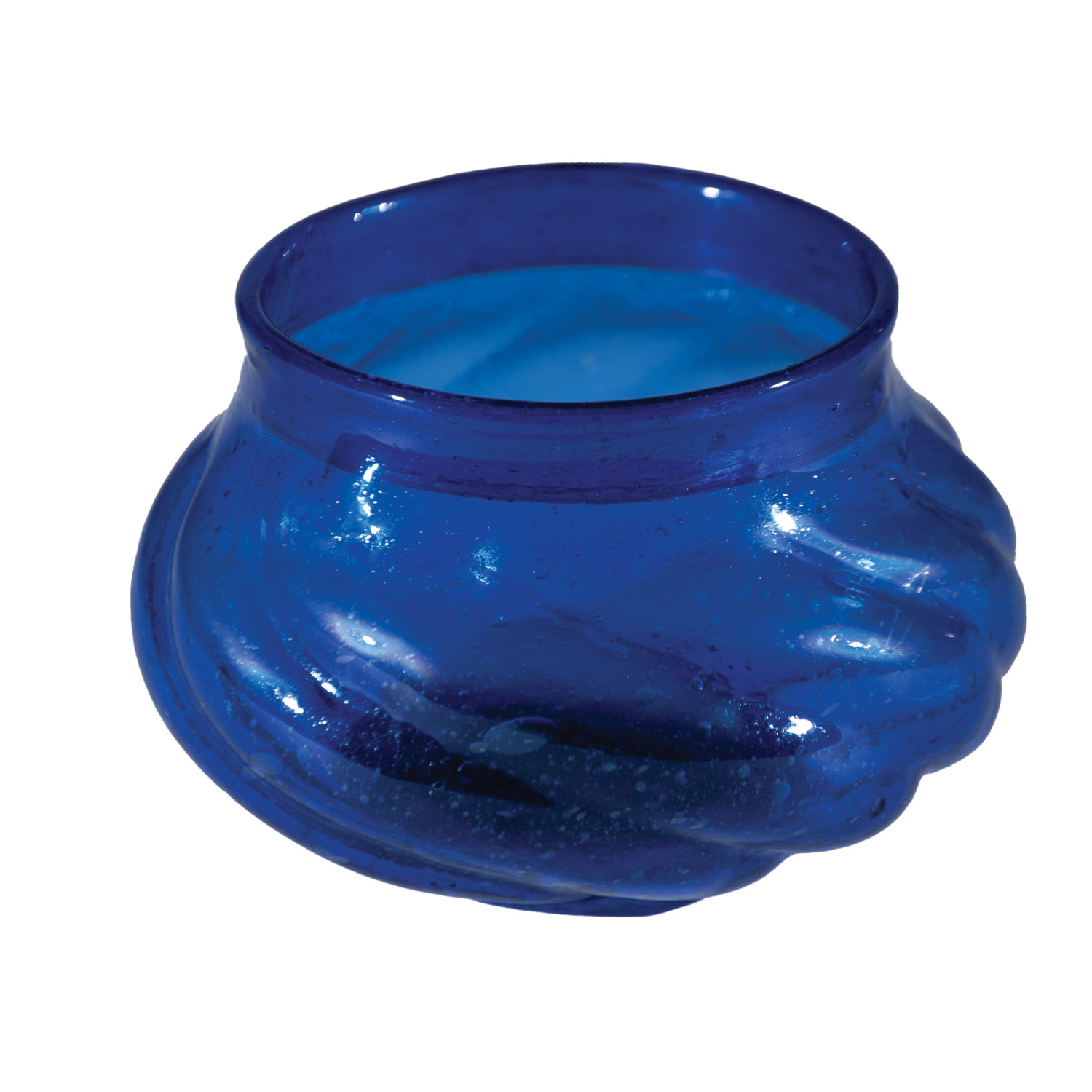 Catalog Name: 5" Round x 3-1/4"H Hand-Blown Seeded Twisted Glass Tealight/Votive Holder, Blue