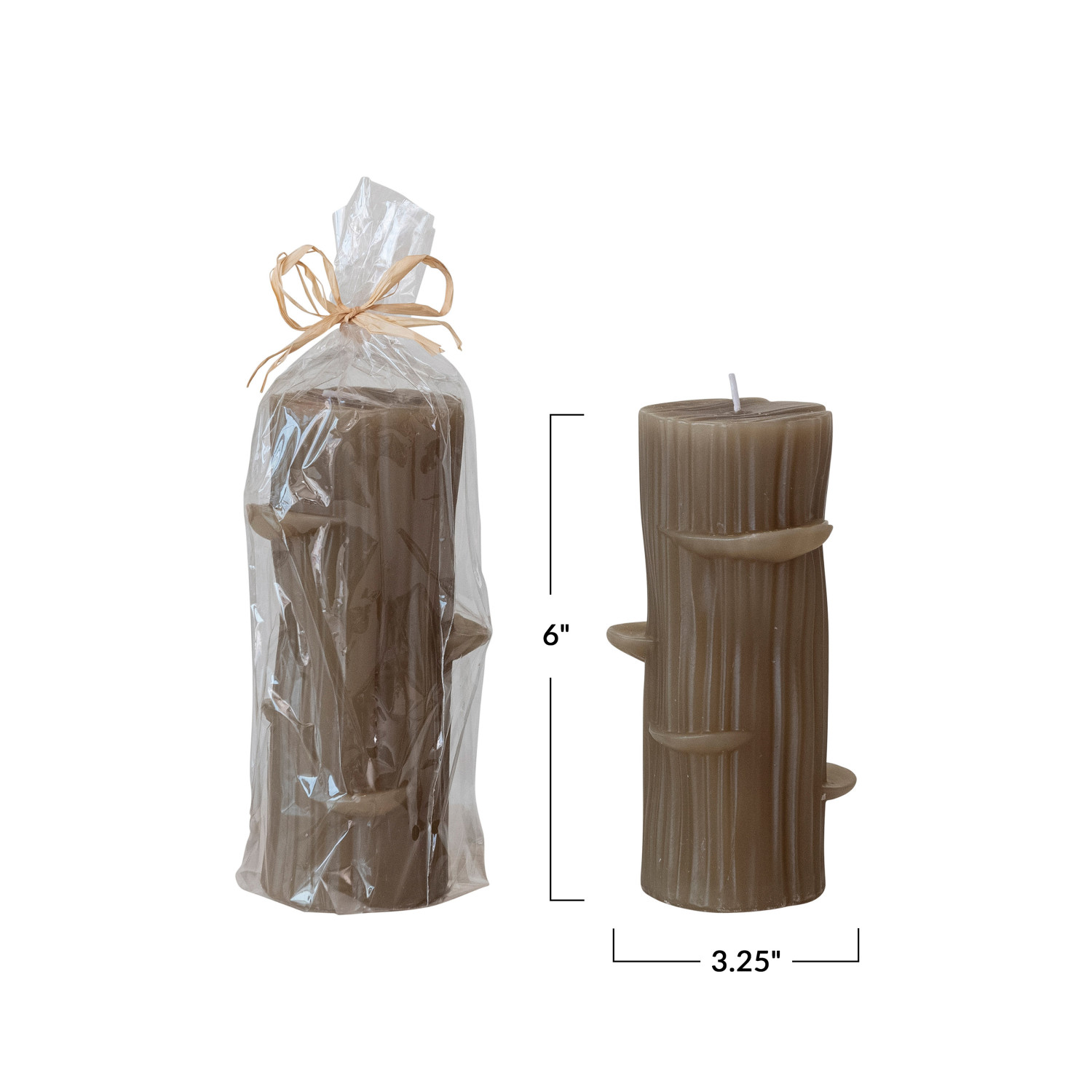 Catalog Name: 3-1/4"L x 2-1/2"W x 6"H Unscented Log Shaped Candle w/ Mushrooms, Olive Color (Est. Burn Time 40 Hours)