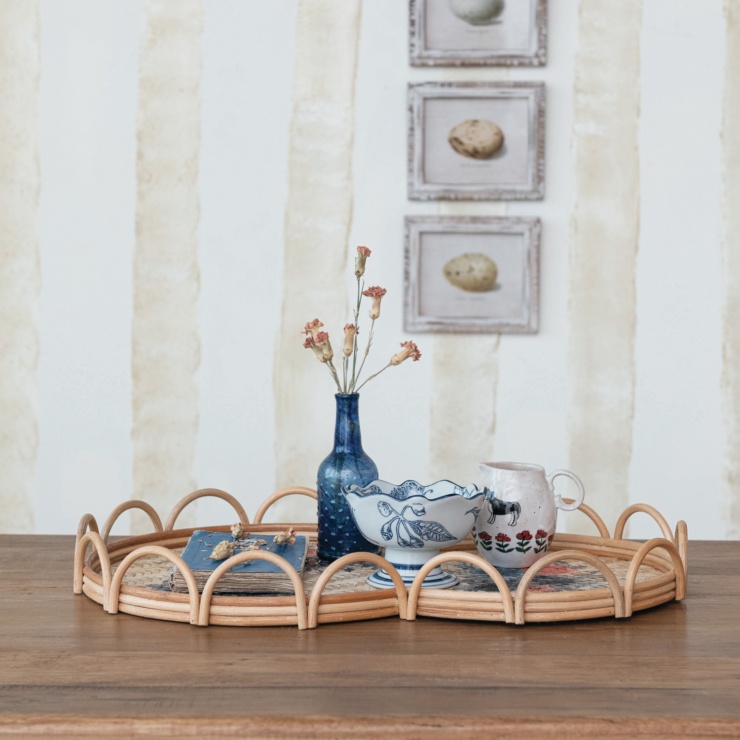 This Decorative Rattan and Bamboo Scalloped Tray is a true celebration of craftsmanship and design. With its generous size of 23.25 inches long and 15 inches wide, it's perfect for serving guests or displaying favorite items. The multi-colored floral patterns bring a burst of life to any room, while the natural materials of bamboo and rattan offer a sustainable and stylish option for the home. The tray's oval shape and scalloped edges provide an elegant touch, making it a versatile piece that complements boho, modern, or Southwestern decor. Whether used for practical purposes or as a statement piece, this tray is sure to captivate and delight.