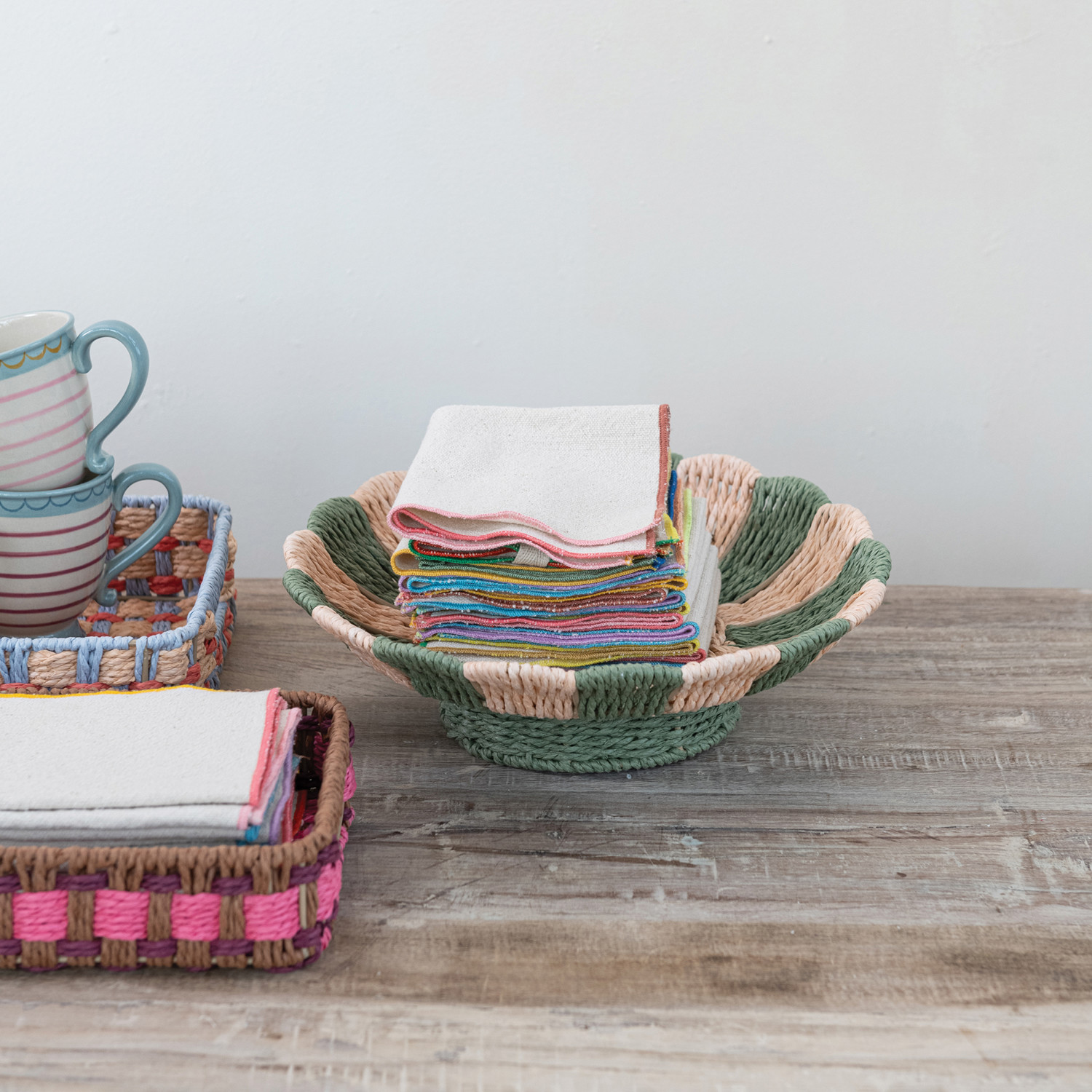 Decorative Woven Paper Rope Scalloped Footed Bowl with Stripes