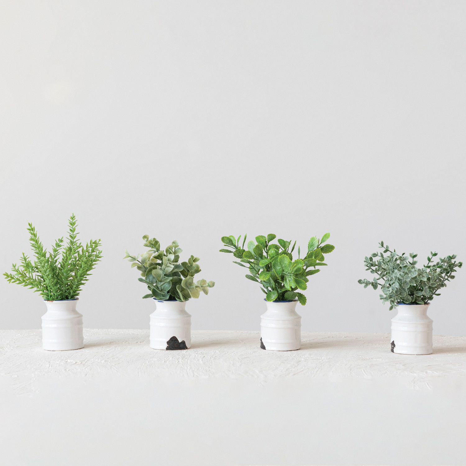 Faux Plant in Stoneware Pot, Distressed White Finish, 4 Styles