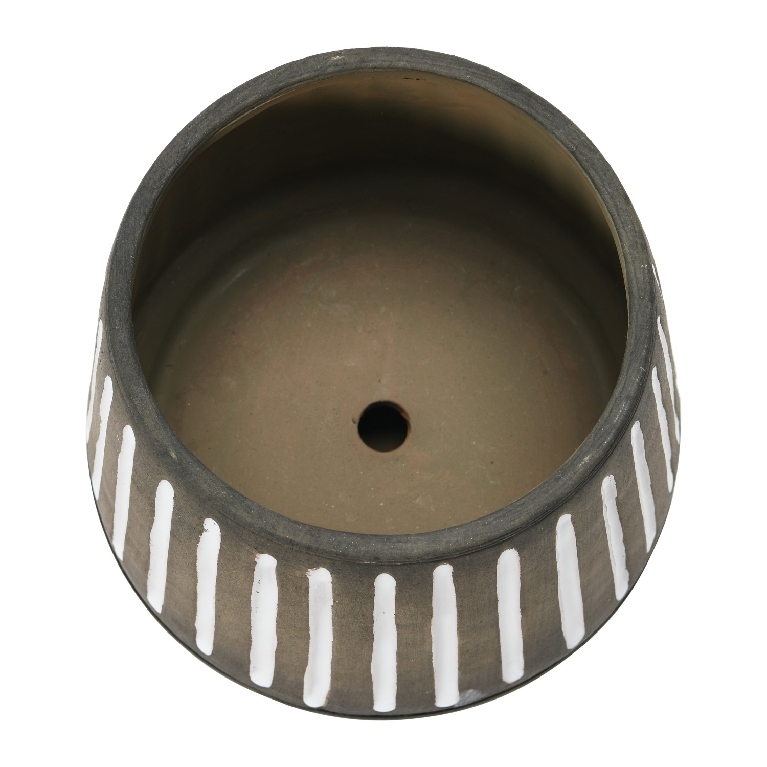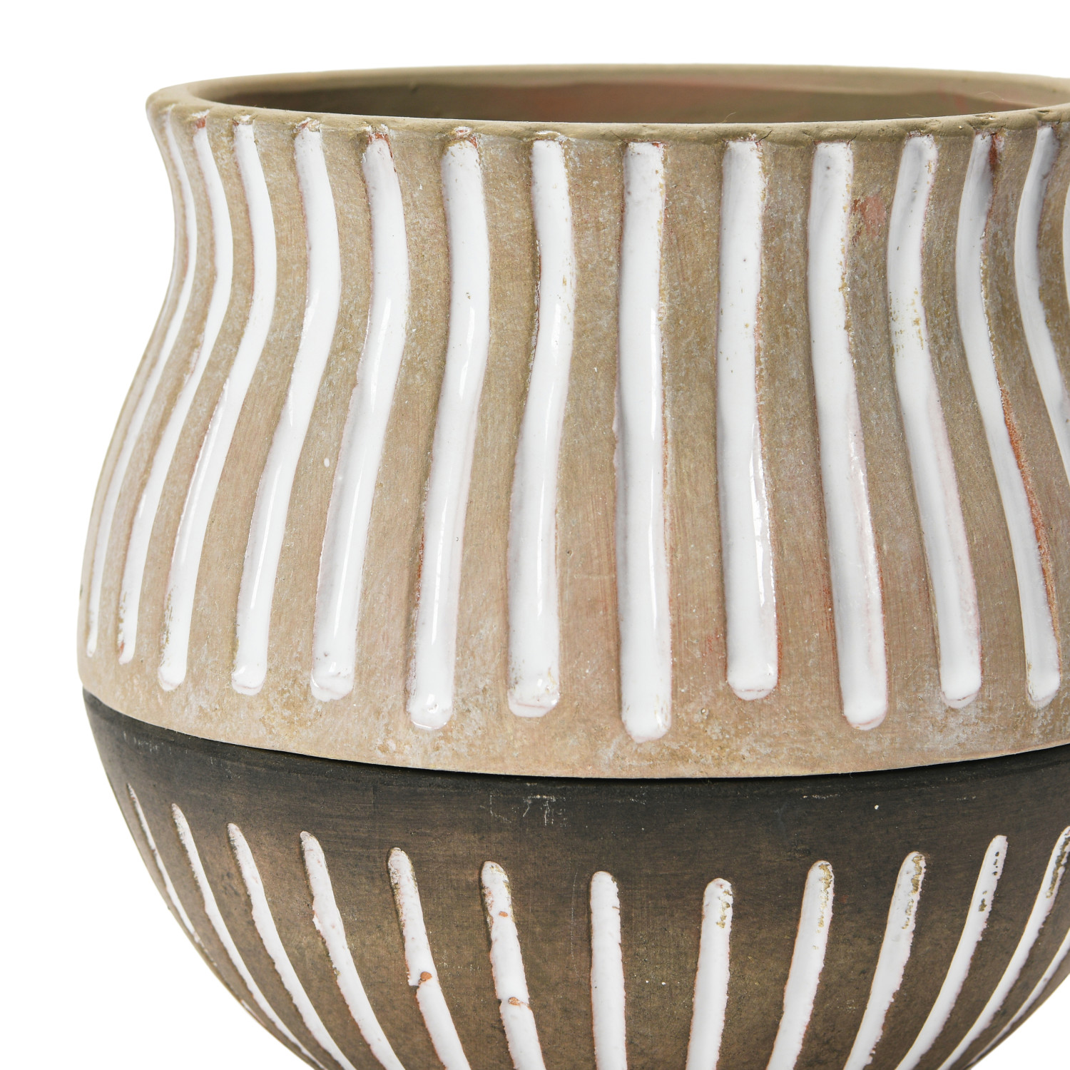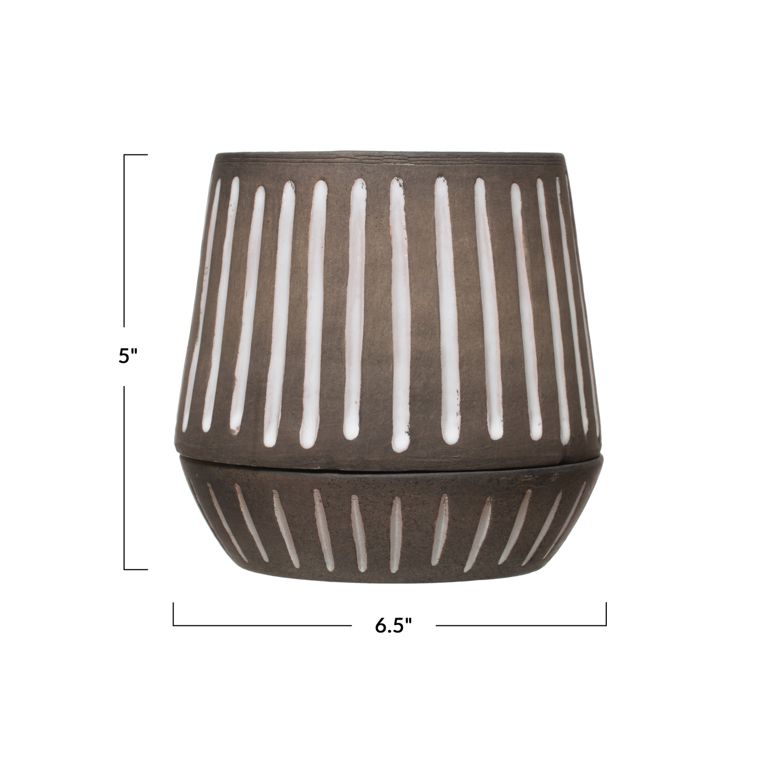 Catalog Name: 7-1/2" Round x 7-1/4"H Hand-Painted Terra-cotta Planter w/ Saucer & Debossed Lines, Brown & White, Set of 2 (Holds 5" Pot)