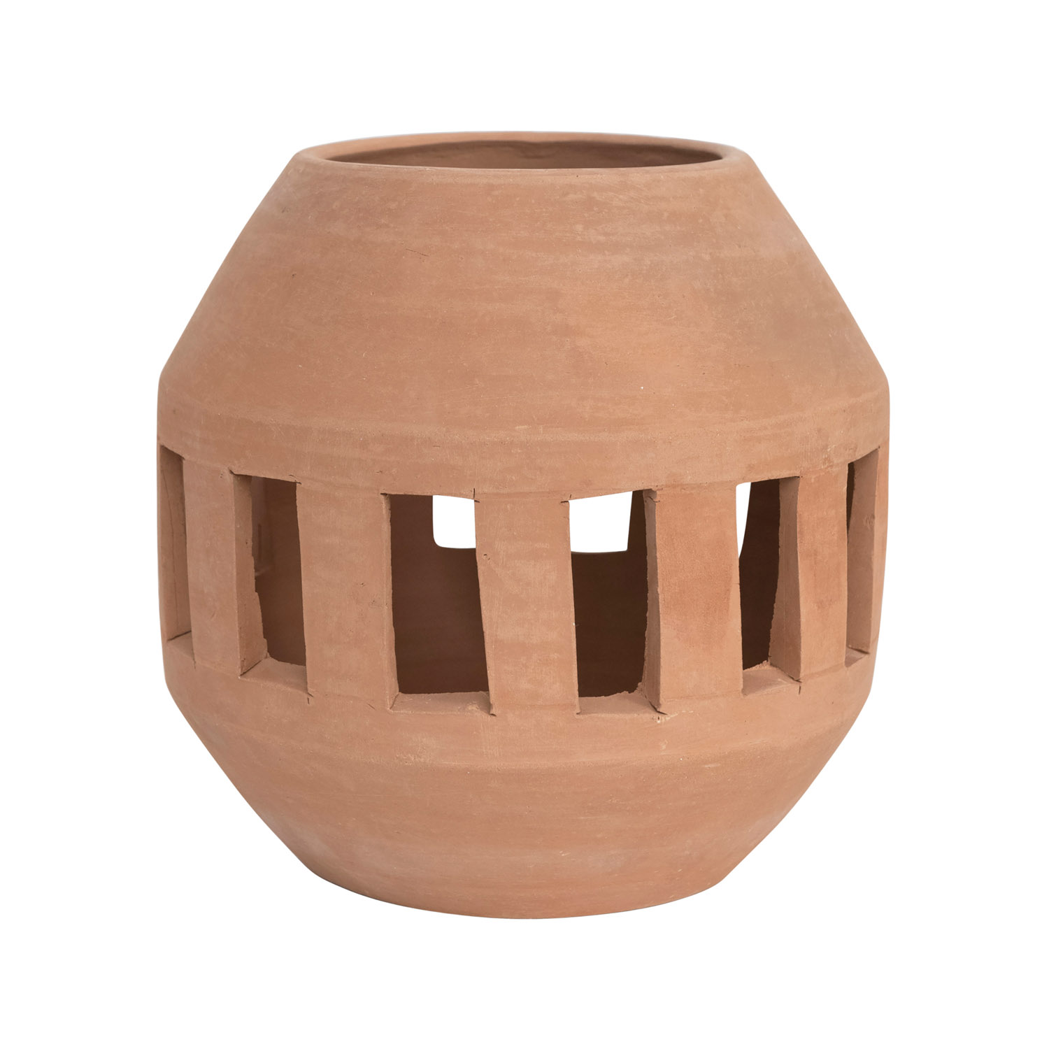 Catalog Name: 9" Round x 8-3/4"H Handmade Terra-cotta Planter/Candle Holder w/ Cut-Outs, Truck Ship (Holds 5" Pot)
