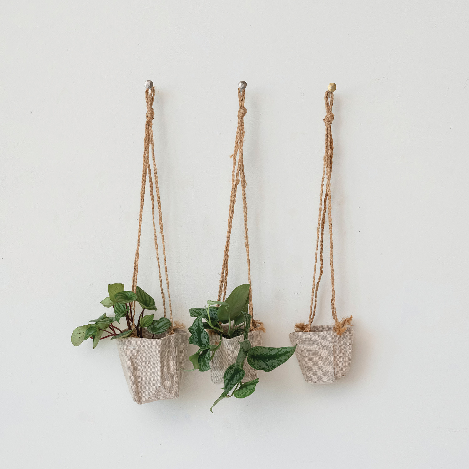 Catalog Name: 5-1/2" Round x 6"H, 4" Round x 5"H & 3" Round x 5"H Decorative Hanging Jute & Cotton Planters w/ Rope Hanger, Natural, Set of 3 (Holds 5", 3" & 2" Pots)