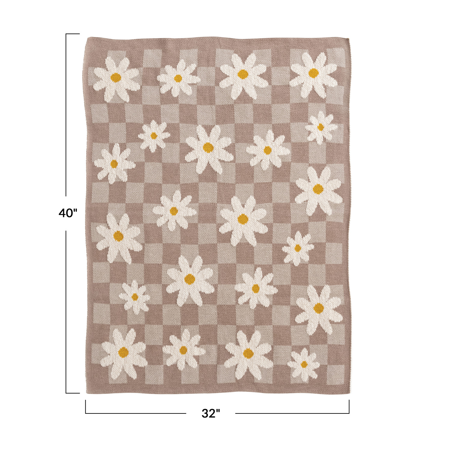 Cotton Knit Baby Blanket w/ Daisies & Check Pattern