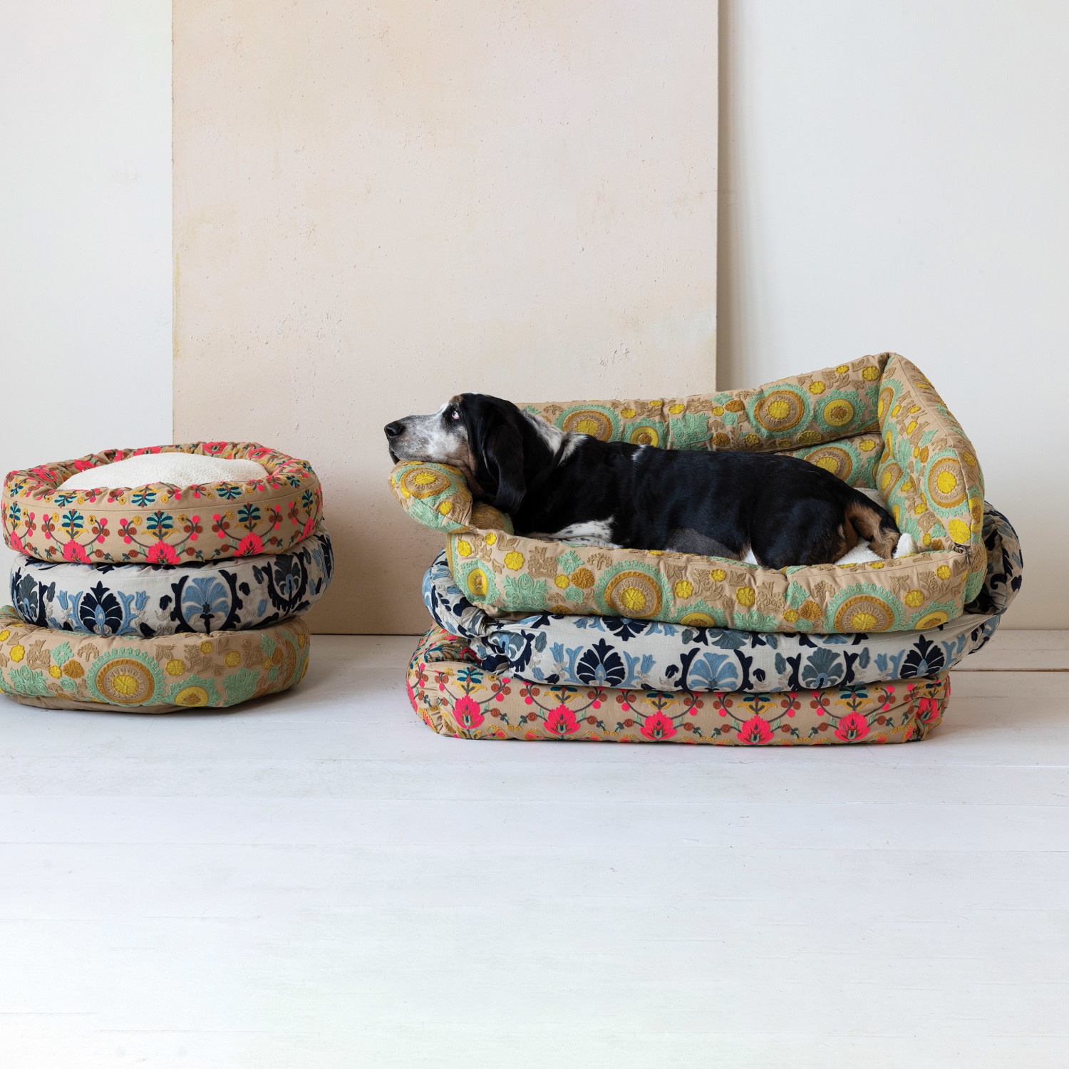 Catalog Name: 24" Round x 6"H Cotton Embroidered & Sherpa Pet Bed w/ Pattern & Washable Cover, Multi Color