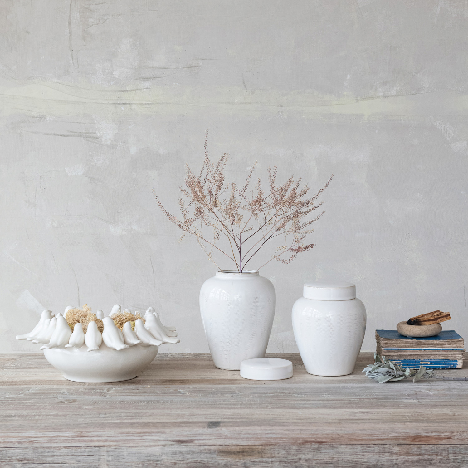 Decorative Stoneware Bowl/Planter with 3D Birds on Rim, White