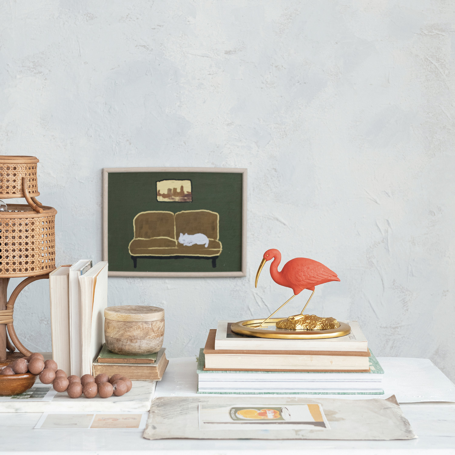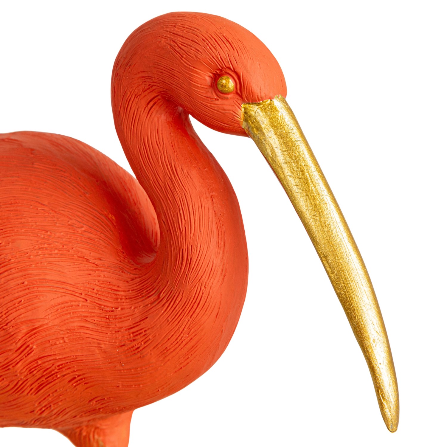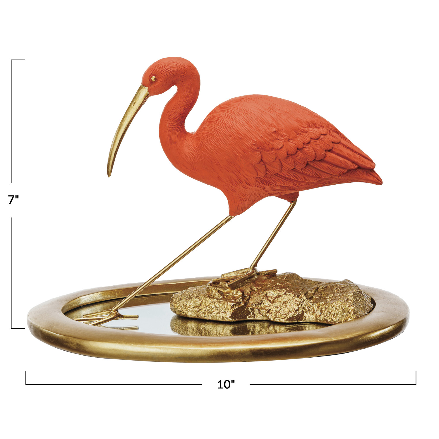 Catalog Name: 10"L x 8-1/4"W x 7"H Resin Scarlet Ibis on Mirrored Tray, Gold Finish & Coral Color