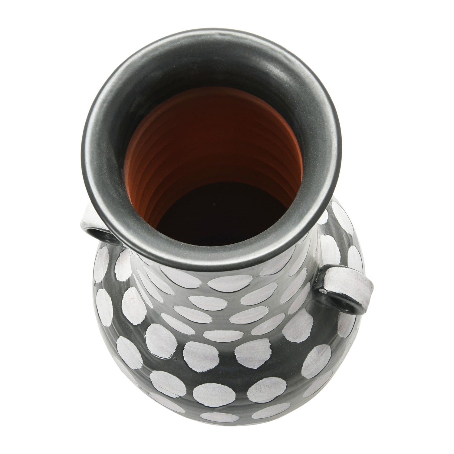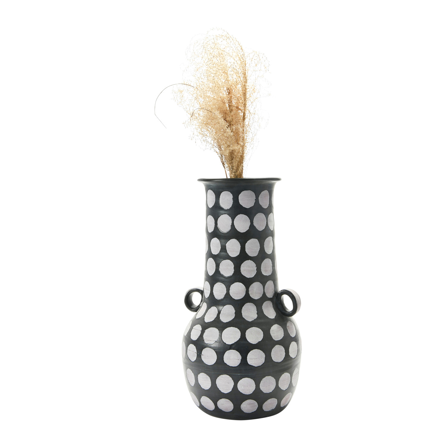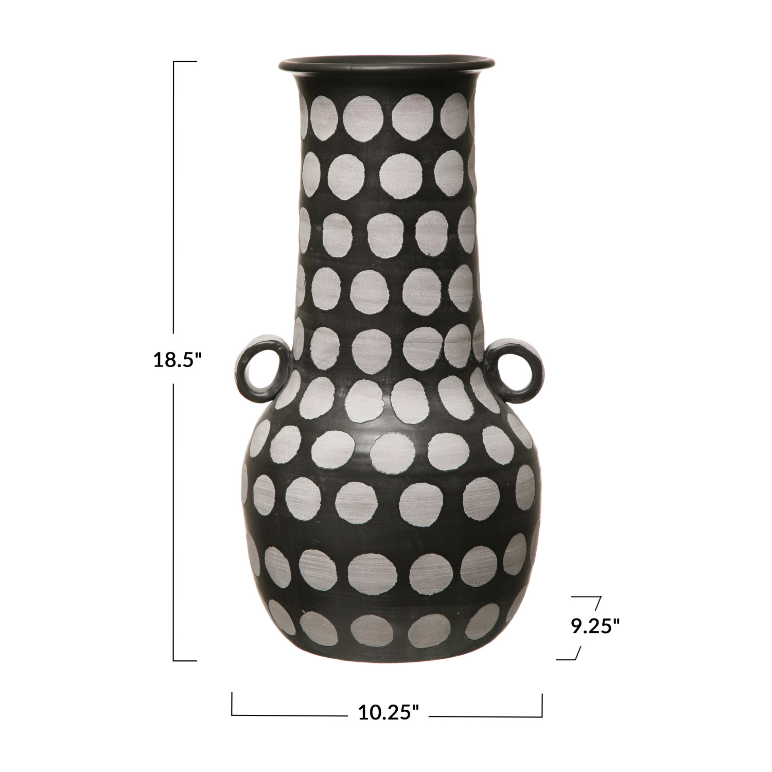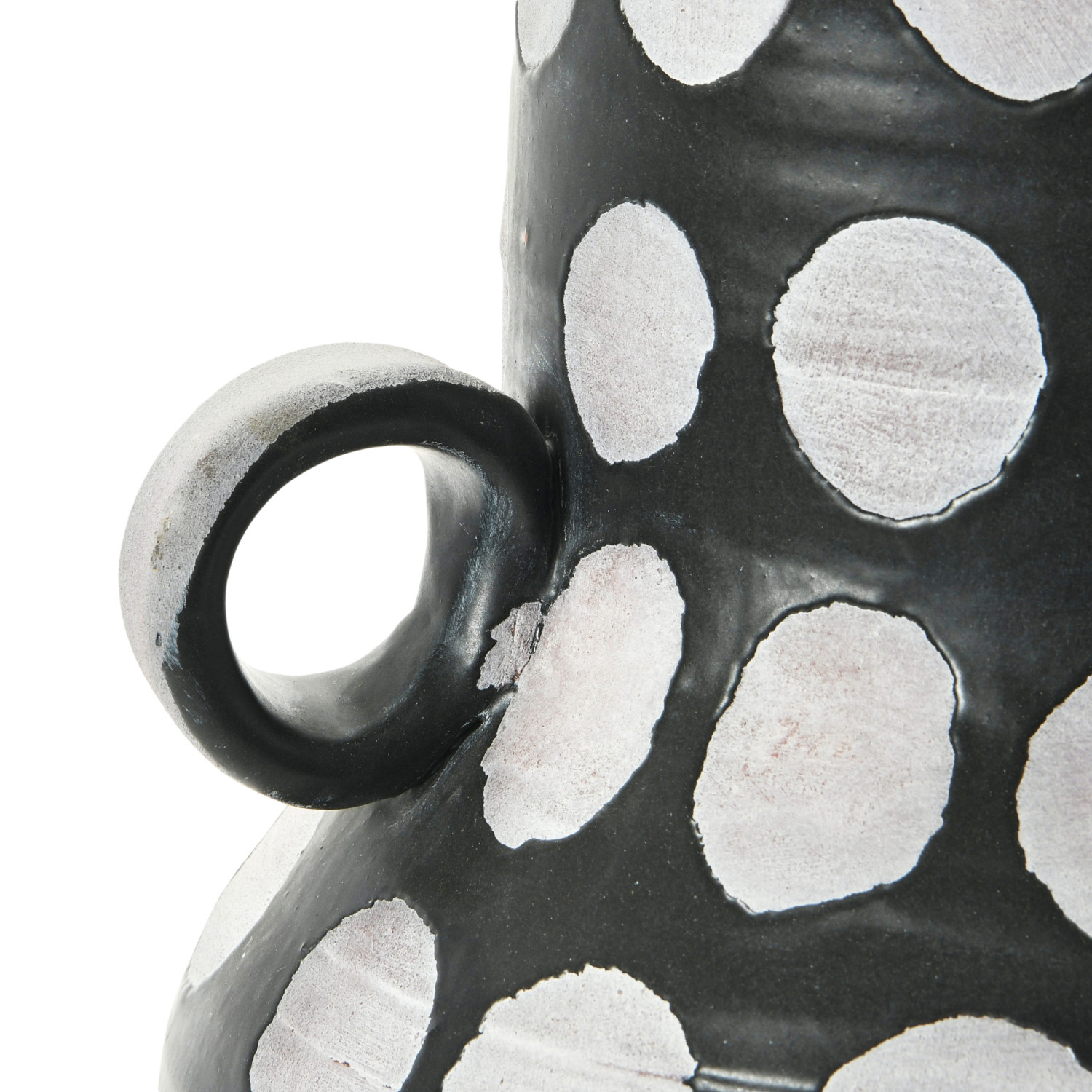 This vase is the perfect unique piece for any table top. Hand-painted, this terracotta vase features a fun black and white polka dot pattern. This vase easily anchors entryways, nightstands, or dressers and blends in with any eclectic decor. Fill with fresh or faux florals for an easy decoration. Perfect for an eclectic home. Great statement piece for any room.