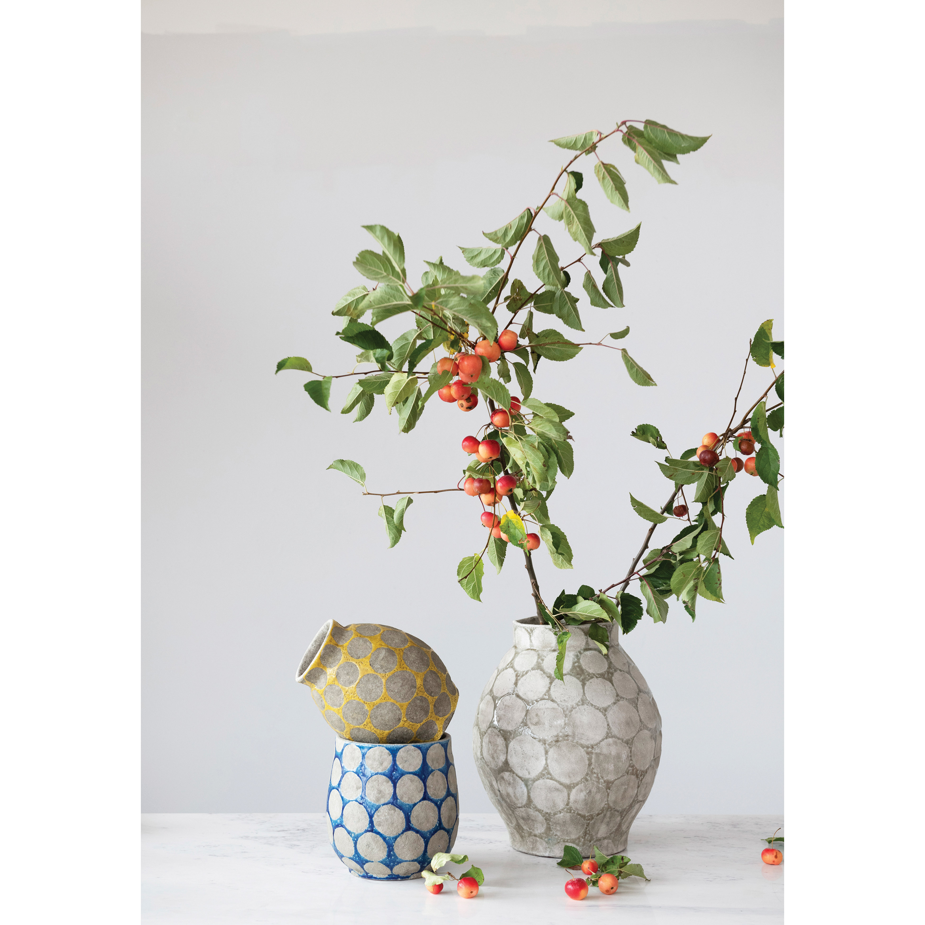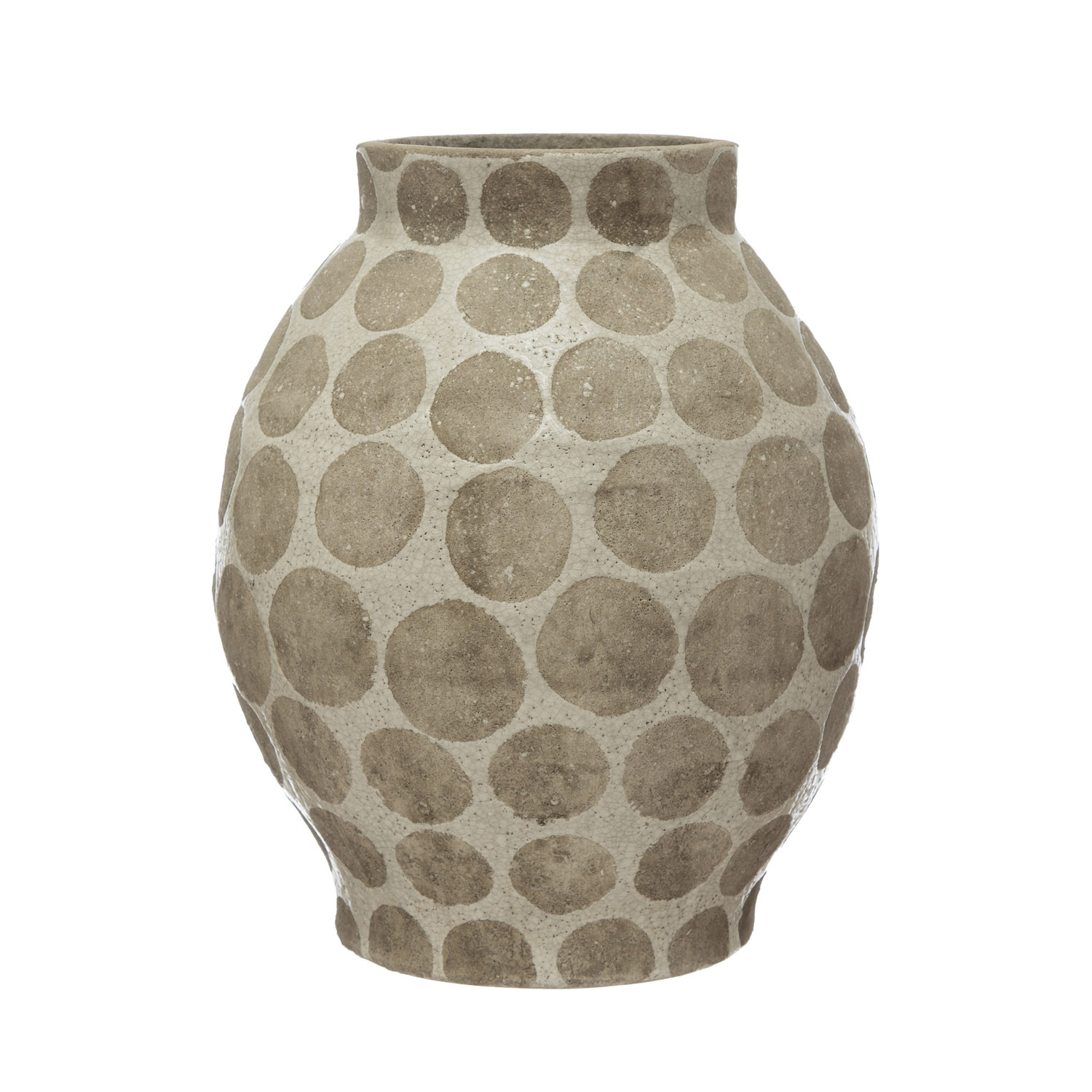 Add some texture and style to the home with this terra-cotta vase that features a cream and cement color scheme and wax relief dots. This vase is perfect for adding a touch of rustic charm to any style of home décor, from farmhouse to bohemian. The vase is designed for decorative purposes only and does not have drainage holes, so it is suitable for displaying dried or artificial flowers. Made of terra-cotta.