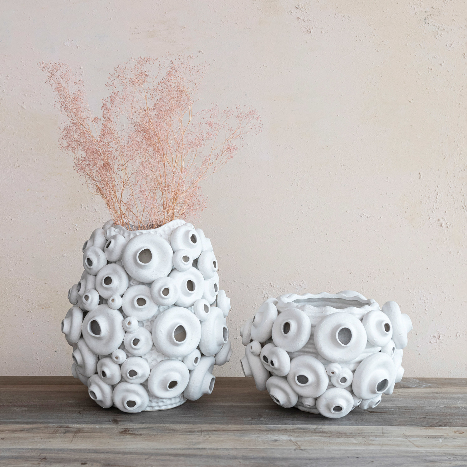 Catalog Name: 13" Round x 8-3/4"H Handmade 3D Textured Stoneware Vase, Sand Finish, White, Truck Ship