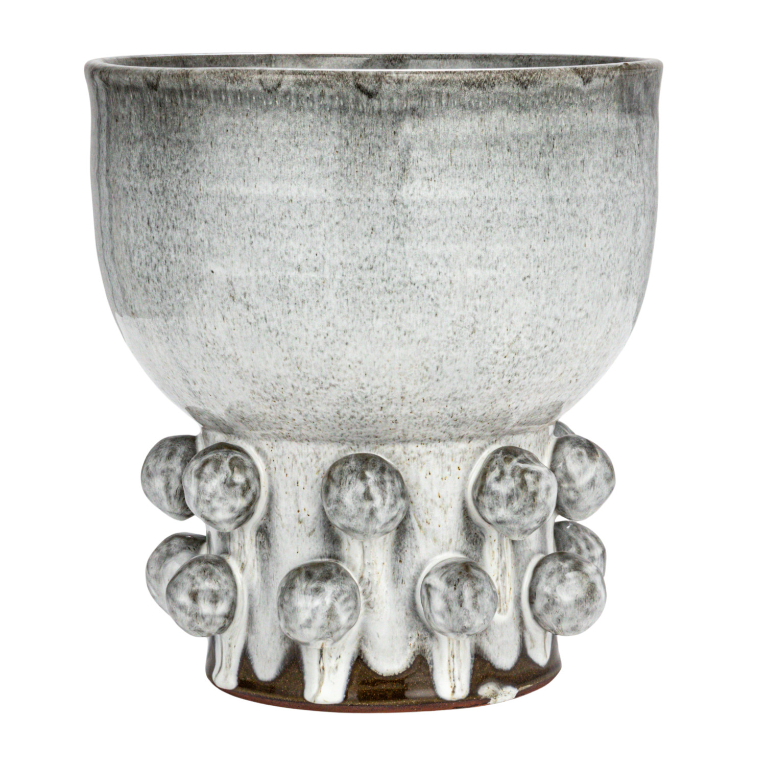 This terra-cotta footed vase with raised dots, white, reactive glaze is a unique and beautiful addition to any home decor. It features a round shape, a glossy finish, and raised dots for dimension. This vase is also ideal for any coastal, beach, farmhouse, French country, or Scandinavian-themed decor, as it adds a touch of texture and elegance. This vase is also perfect for displaying fresh or dried flowers, branches, or greenery, as it creates a stunning and natural look. It is made of terra-cotta, a type of clay that is durable and easy to clean. This vase measures 11 inches in diameter and 12.25 inches in height. This vase is a great gift for anyone.
