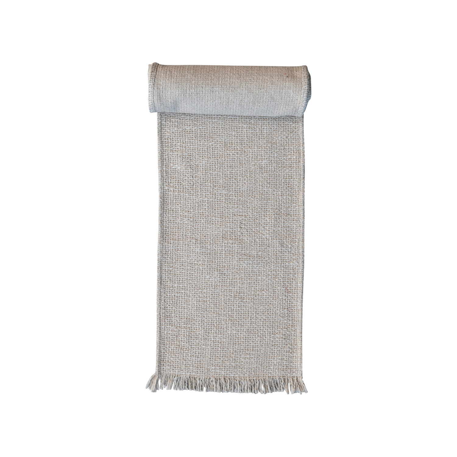 Add some glamour and elegance to the dining table with this woven cotton table runner with metallic gold thread and fringe, natural. This table runner is a sophisticated and chic piece that features a natural color and a metallic gold thread and fringe that adds some shine and texture to any space. The table runner is suitable for any occasion, whether it is a casual family meal, a festive holiday celebration, or a special event. The table runner is made of a blend of cotton and lurex, which makes it soft, smooth, durable, and easy to care for. The table runner measures 108 inches in length and 14 inches in width, making it a great fit for most tables. Transform any table into a stylish display with this versatile and functional table runner. A woven cotton table runner with a natural color and a metallic gold thread and fringe that adds some shine and texture. A sophisticated and chic piece that can add some glamour and elegance to the dining table. This table runner is perfect for any occasion, whether it is a casual family meal, a festive holiday celebration, or a special event.